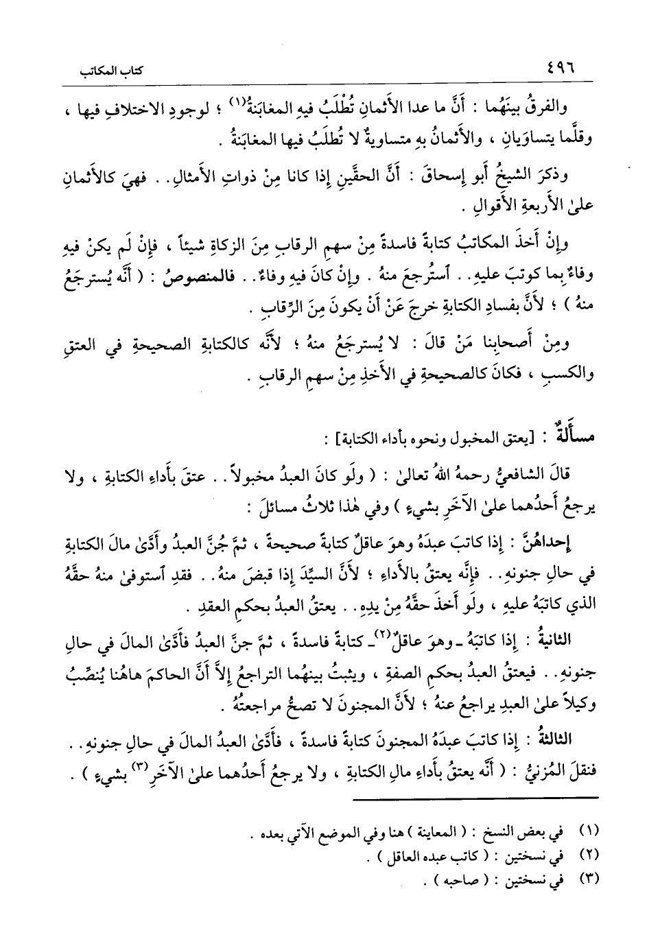 وإن أخذ المكاتب كتابة فاسدة من سهم الرقاب من الزكاة شيئا، فإن لم يكن فيه وفاء بما كوتب عليه.. استرجع منه. وإن كان فيه وفاء.. فالمنصوص: (أنه يسترجع منه) ؛ لأن بفساد الكتابة خرج عن أن يكون من الرقاب.