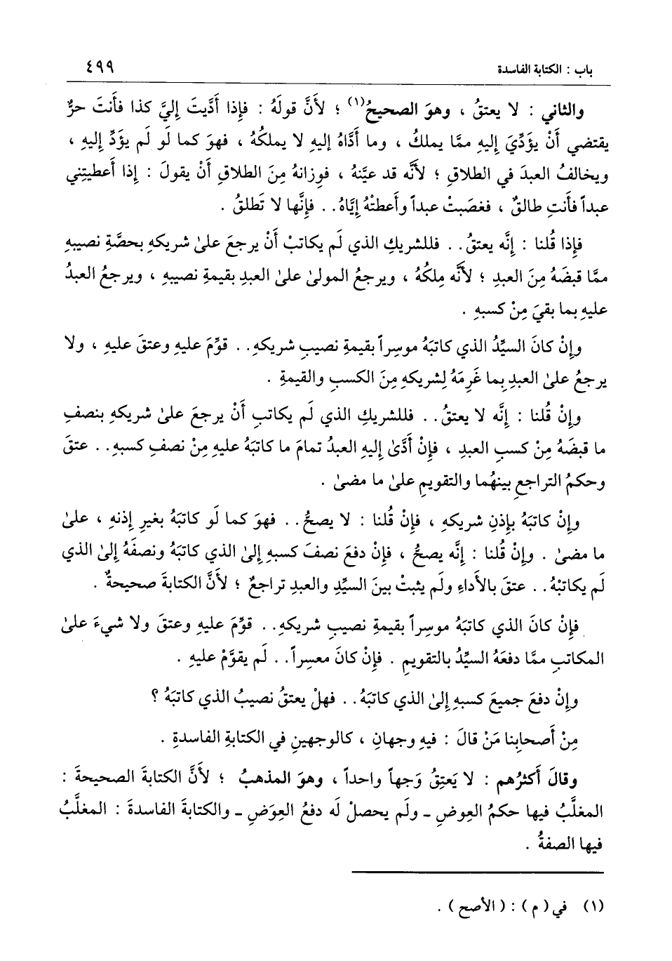 وقال أكثرهم: لا يعتق وجها واحدا، وهو المذهب؛ لأن الكتابة الصحيحة: المغلب فيها حكم العوض ـ ولم يحصل له دفع العوض ـ والكتابة الفاسدة: المغلب فيها الصفة.
