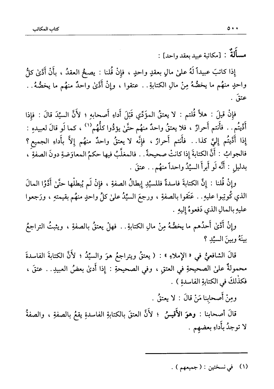 فإن قيل: هلا قلتم: لا يعتق المؤدي قبل أداء أصحابه؛ لأن السيد قال: فإذا أديتم.. فأنتم أحرار، فلا يعتق واحد منهم حتى يؤدوا كلهم، كما لو قال لعبيده: إذا أديتم إلي كذا.. فأنتم أحرار، فإنه لا يعتق واحد منهم إلا بأداء الجميع؟ فالجواب: أن الكتابة إذا كانت صحيحة.. فالمغلب فيها حكم المعاوضة دون الصفة، بدليل: أنه لو أبرأ السيد واحدا منهم.. عتق.