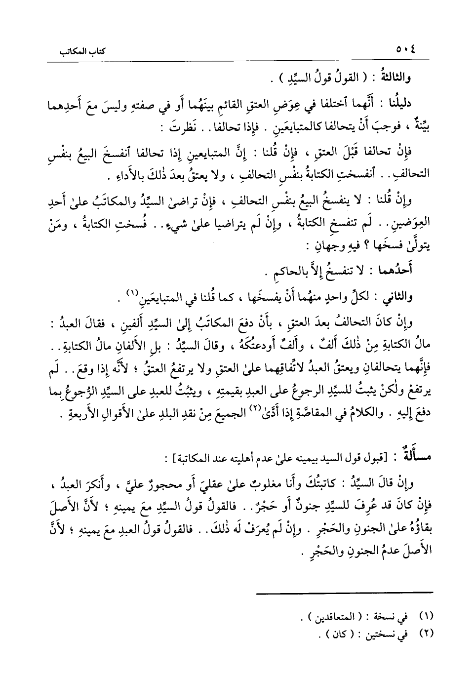 ) : وإن قال السيد: كاتبتك وأنا مغلوب على عقلي أو محجور علي، وأنكر العبد، فإن كان قد عرف للسيد جنون أو حجر.. فالقول قول السيد مع يمينه؛ لأن الأصل بقاؤه على الجنون والحجر. وإن لم يعرف له ذلك.. فالقول قول العبد مع يمينه؛ لأن الأصل عدم الجنون والحجر.