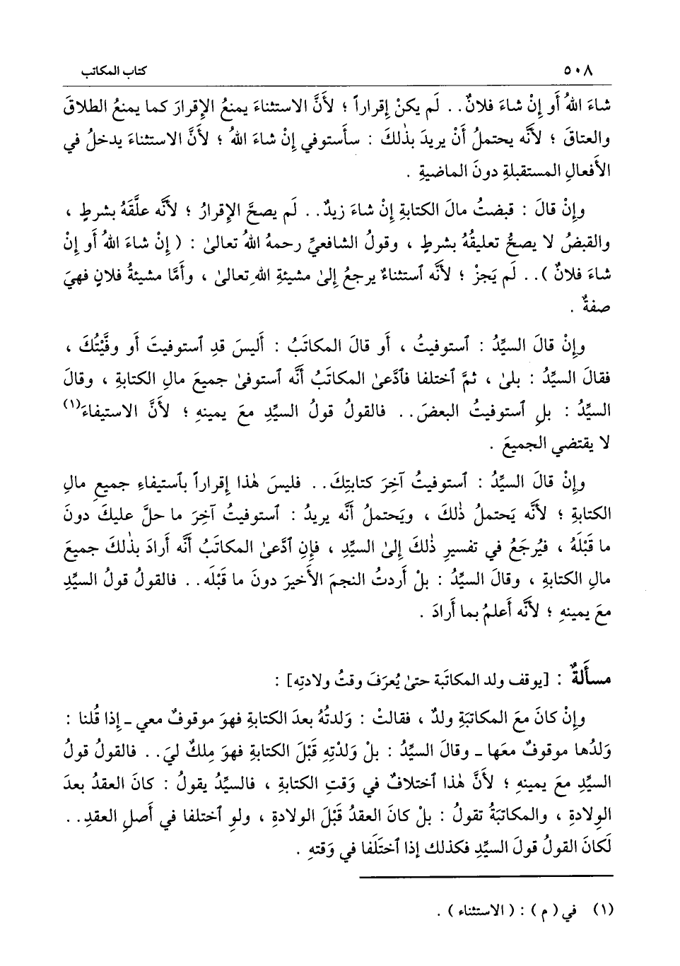 وإن قال: قبضت مال الكتابة إن شاء زيد.. لم يصح الإقرار؛ لأنه علقه بشرط، والقبض لا يصح تعليقه بشرط، وقول الشافعي - رَحِمَهُ اللَّهُ تَعَالَى -: (إن شاء الله أو إن شاء فلان) .. لم يجز؛ لأنه استثناء يرجع إلى مشيئة الله تعالى، وأما مشيئة فلان فهي صفة.