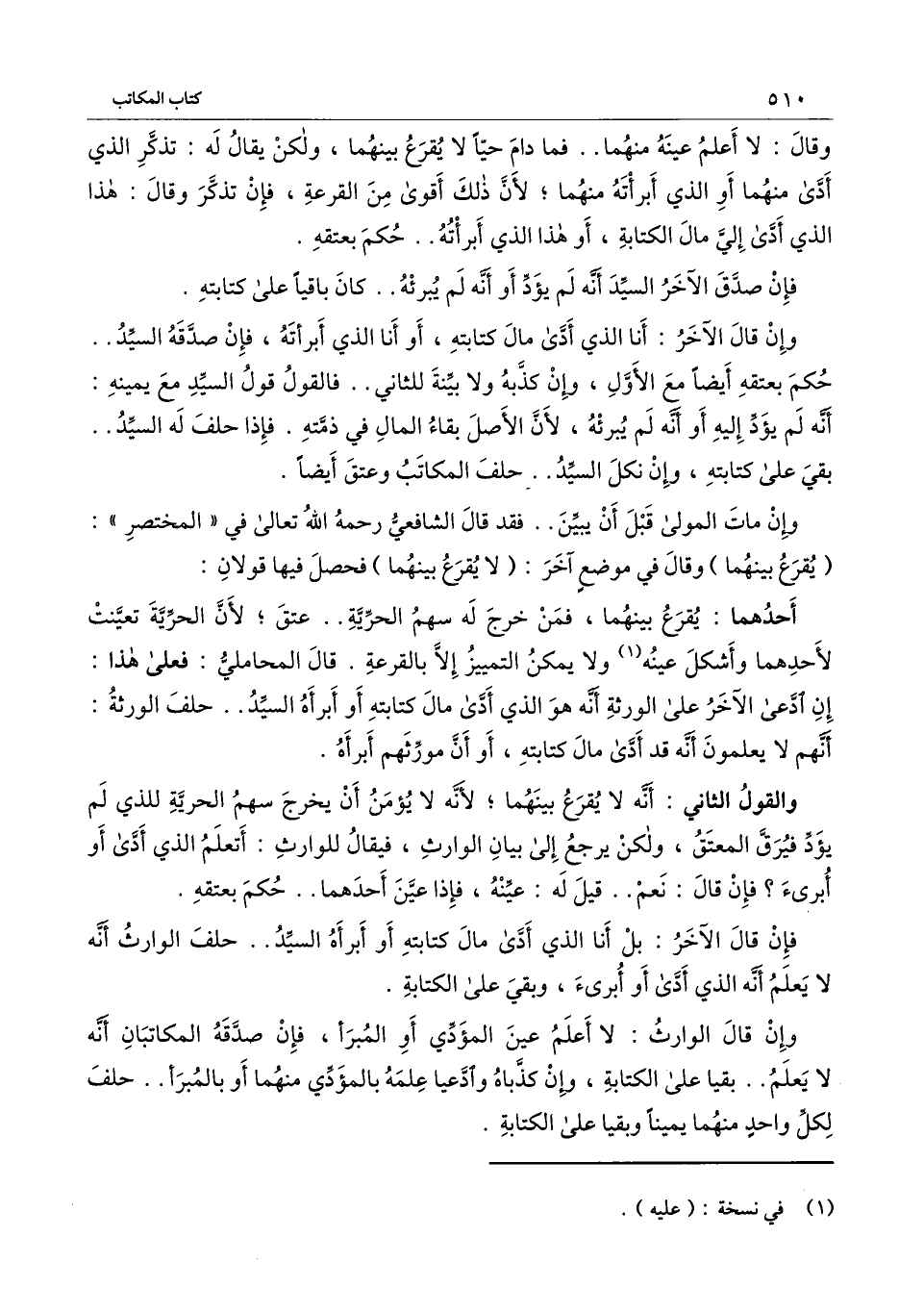 فإن قال الآخر: بل أنا الذي أدى مال كتابته أو أبرأه السيد.. حلف الوارث أنه لا يعلم أنه الذي أدى أو أبرئ.. وبقي على الكتابة. وإن قال الوارث: لا أعلم عين المؤدي أو المبرأ، فإن صدقه المكاتبان أنه لا يعلم.. بقيا على الكتابة، وإن كذباه وادعيا علمه بالمؤدي منهما أو بالمبرأ.. حلف لكل واحد منهما يمينا وبقيا على الكتابة.