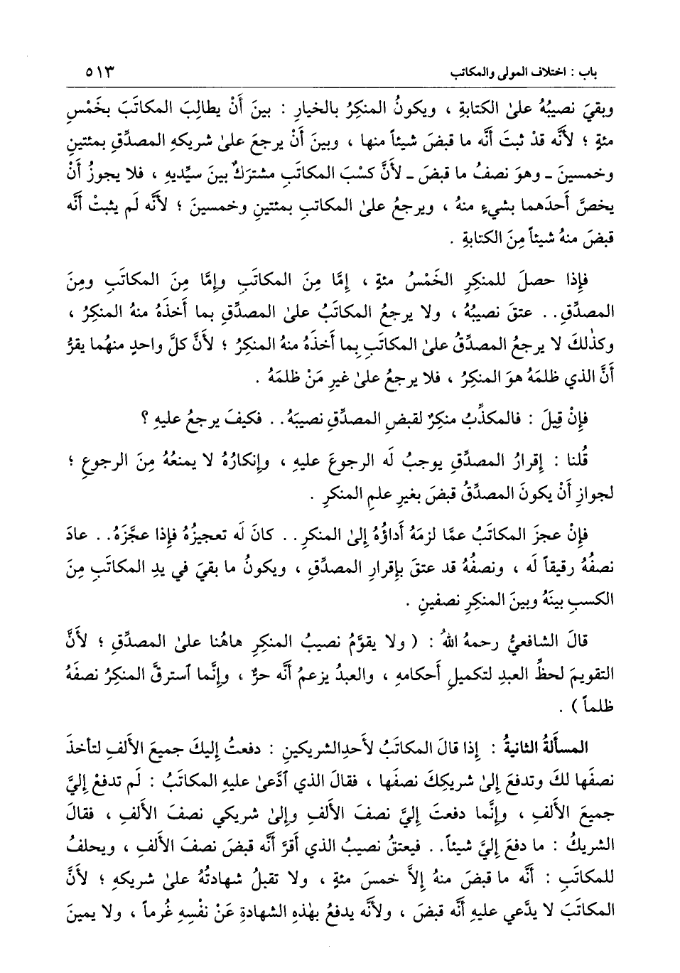 المسألة الثانية: إذا قال المكاتب لأحد الشريكين: دفعت إليك جميع الألف لتأخذ نصفها لك وتدفع إلى شريكك نصفها، فقال الذي ادعى عليه المكاتب: لم تدفع إلي جميع الألف، وإنما دفعت إلي نصف الألف وإلى شريكي نصف الألف، فقال الشريك: ما دفع إلي شيئا.. فيعتق نصيب الذي أقر أنه قبض نصف الألف، ويحلف للمكاتب: أنه ما قبض منه إلا خمسمائة، ولا تقبل شهادته على شريكه؛ لأن المكاتب لا يدعي عليه أنه قبض، ولأنه يدفع بهذه الشهادة عن نفسه غرما، ولا يمين