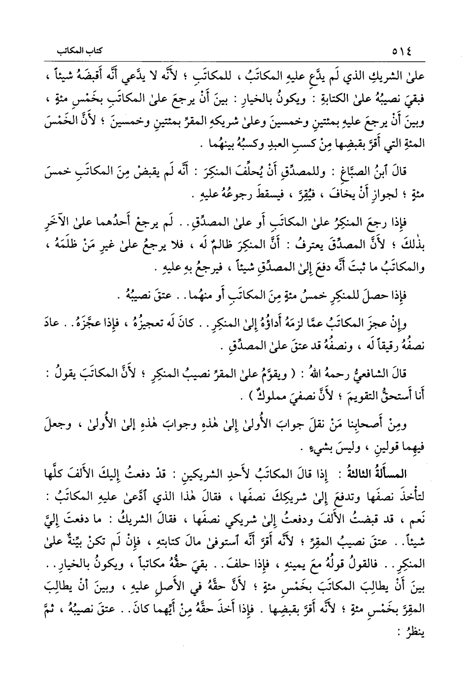 المسألة الثالثة: إذا قال المكاتب لأحد الشريكين: قد دفعت إليك الألف كلها لتأخذ نصفها وتدفع إلى شريكك نصفها، فقال هذا الذي ادعى عليه المكاتب: نعم، قد قبضت الألف ودفعت إلى شريكي نصفها، فقال الشريك: ما دفعت إلي شيئا.. عتق نصيب المقر؛ لأنه أقر أنه استوفى مال كتابته، فإن لم تكن بينة على المنكر.. فالقول قوله مع يمينه، فإذا حلف.. بقي حقه مكاتبا، ويكون بالخيار.. بين أن يطالب المكاتب بخمسمائة؛ لأن حقه في الأصل عليه، وبين أن يطالب المقر بخمسمائة؛ لأنه أقر بقبضها. فإذا أخذ حقه من أيهما كان.. عتق نصيبه، ثم ينظر: