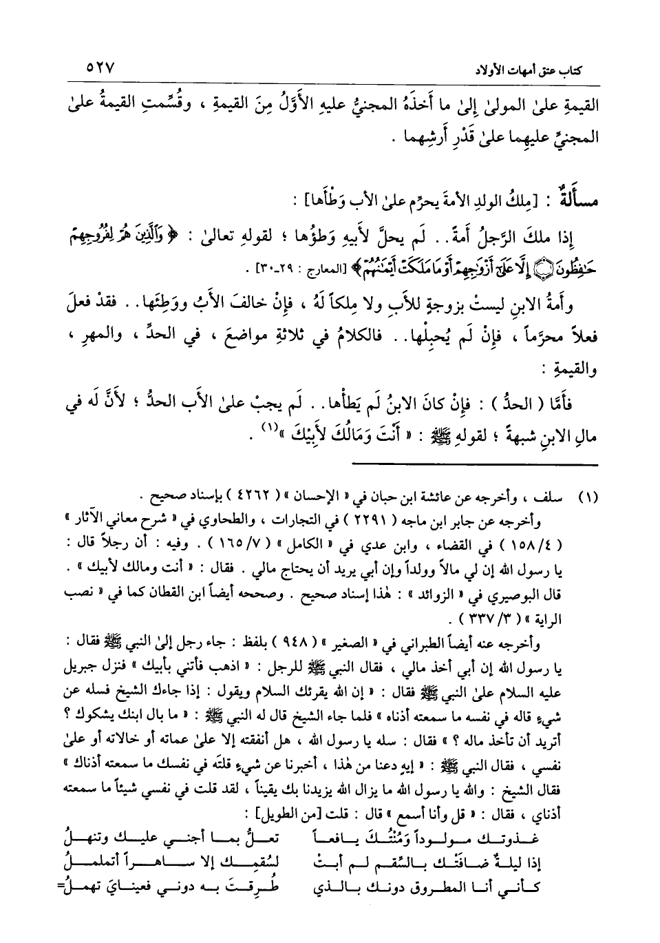 ) : إذا ملك الرجل أمة.. لم يحل لأبيه وطؤها؛ لِقَوْلِهِ تَعَالَى: {وَالَّذِينَ هُمْ لِفُرُوجِهِمْ حَافِظُونَ} [المعارج: 29] {إِلا عَلَى أَزْوَاجِهِمْ أَوْ مَا مَلَكَتْ أَيْمَانُهُمْ} [المعارج: 30] (المعارج: 29 ـ 30) .