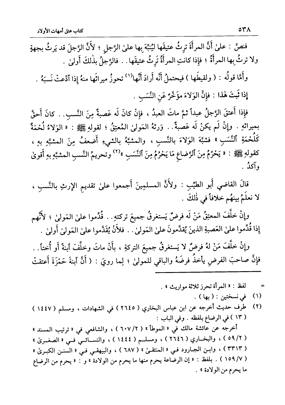 فإذا أعتق الرجل عبدًا ثم مات العبد، فإن كان له عصبة من النسب.. كان أحق بميراثه. وإن لم يكن له عصبة.. ورثه المولى المعتق؛ لقوله - صَلَّى اللَّهُ عَلَيْهِ وَسَلَّمَ -: «الولاء لحمة كلحمة النسب» فشبه الولاء بالنسب، والمشبه بالشيء أضعف من المشبه به، كقوله - صَلَّى اللَّهُ عَلَيْهِ وَسَلَّمَ -: «يحرم من الرضاع ما يحرم من النسب» وتحريم النسب المشبه به أقوى وآكد.