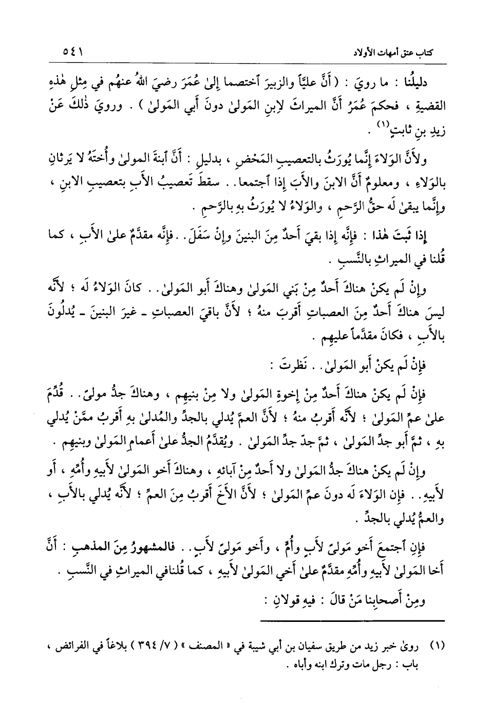 فإن لم يكن هناك أحد من إخوة المولى ولا من بينهم، وهناك جد مولى.. قدم على عم المولى؛ لأنه أقرب منه؛ لأن العم يدلي بالجد والمدلى به أقرب ممن يدلي به، ثم أبو جد المولى، ثم جد جد المولى. ويقدم الجد على أعمام المولى وبنيهم.