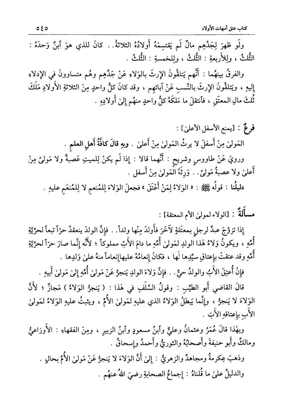 ) : إذا تزوج عبد لرجل بمعتقة لآخر فأولد منها ولداً.. فإن الولد ينعقد حراً تبعاً لحرية أمه، ويكون ولاء هذا الولد لمولى أمه ما دام الأب مملوكاً؛ لأنه إنما صار حراً لحرية أمه وقد عتقت بإعتاق سيدها لها، فكان إنعامه عليها إنعاماً منه على ولدها.