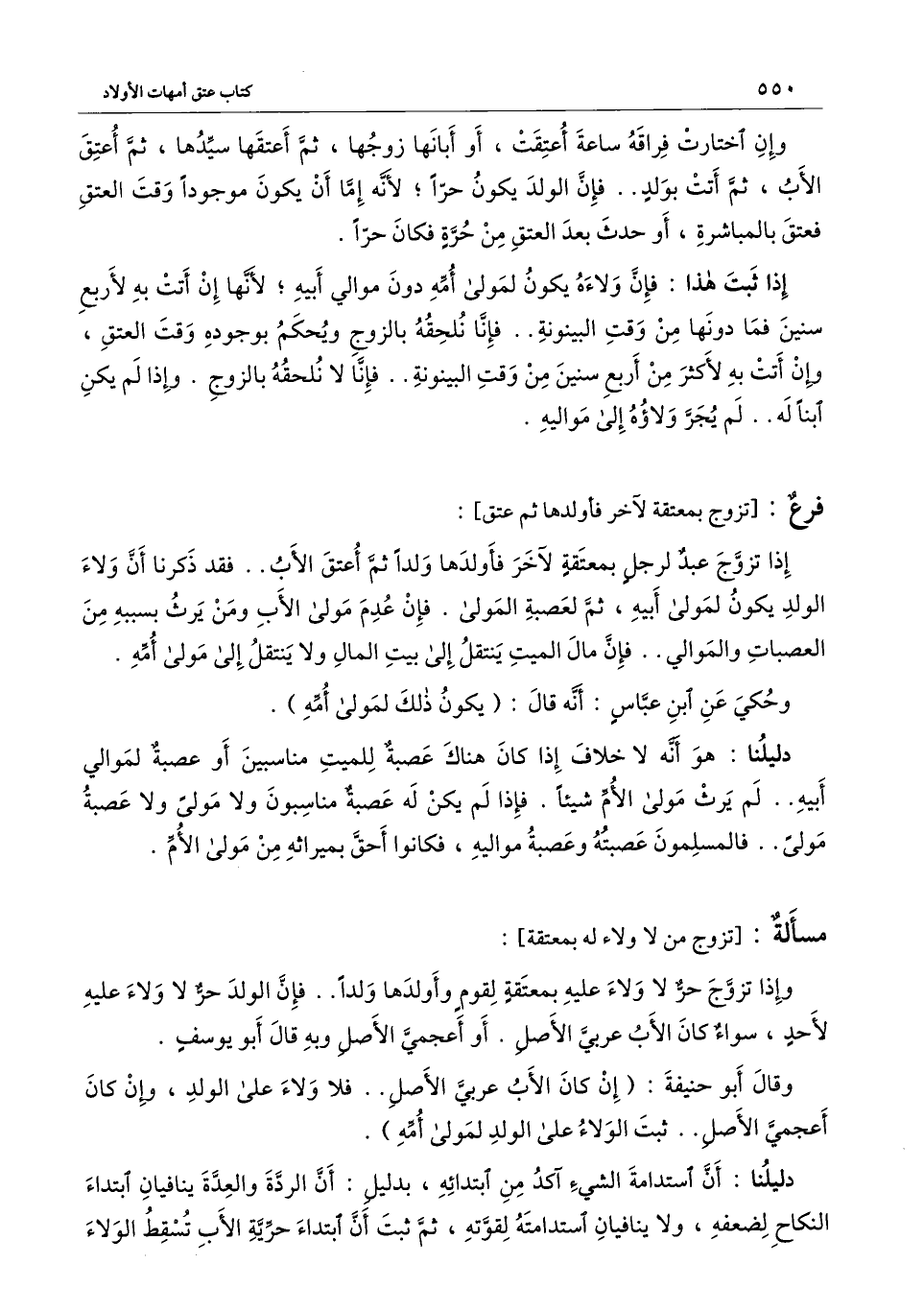 ] : وإذا تزوج حر لا ولاء عليه بمعتقة لقوم وأولدها ولداً.. فإن الولد حر لا ولاء عليه لأحد، سواء كان الأب عربي الأصل. أو أعجمي الأصل وبه قال أبو يوسف.