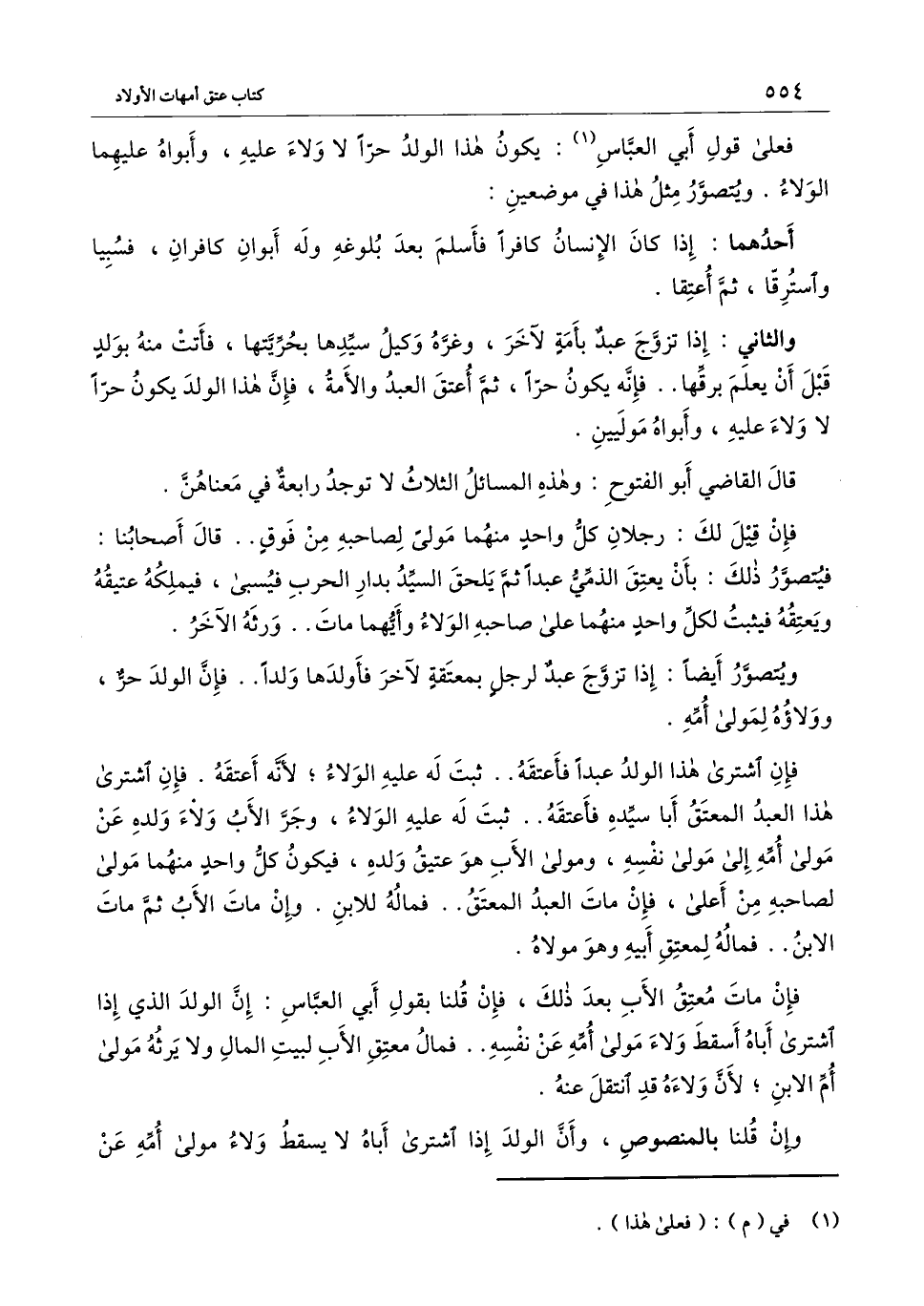 فعلى قول أبي العباس: يكون هذا الولد حراً لا ولاء عليه، وأبواه عليهما الولاء. ويتصور مثل هذا في موضعين: