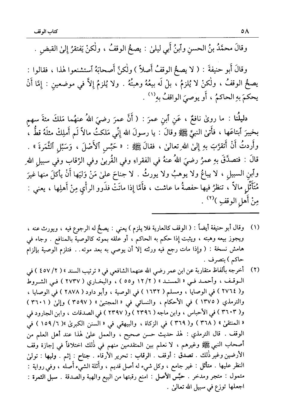 وقال أبو حنيفة: (لا يصح الوقف أصلا) ولكن أصحابه استشنعوا هذا، فقالوا: يصح الوقف، ولكن لا يلزم، بل له بيعه وهبته. ولا يلزم إلا في موضعين: إما أن يحكم به الحاكم، أو يوصي الواقف به.