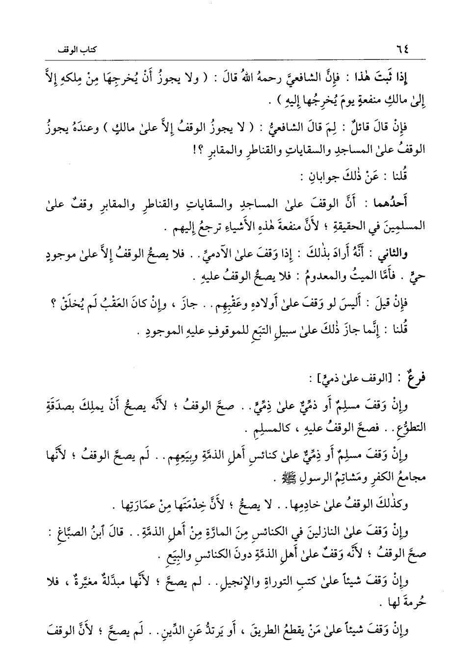 فإن قال قائل: لم قال الشافعي: (لا يجوز الوقف إلا على مالك) وعنده يجوز الوقف على المساجد والسقايات والقناطر والمقابر؟!