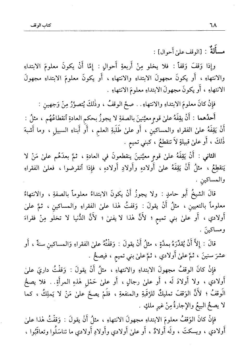 وإذا وقف وقفًا: فلا يخلو من أربعة أحوال: إما أن يكون معلوم الابتداء والانتهاء، أو يكون مجهول الابتداء والانتهاء، أو يكون معلوم الابتداء مجهول الانتهاء، أو يكون مجهول الابتداء معلوم الانتهاء.