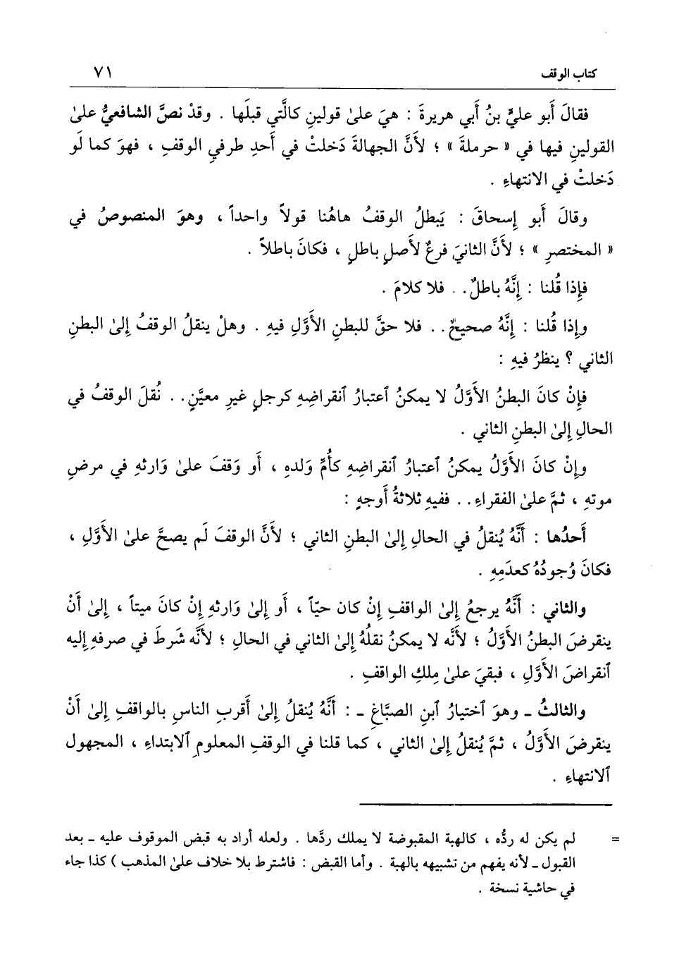 وقال أبو إسحاق: يبطل الوقف هاهنا قولًا واحدًا، وهو المنصوص في (المختصر) ؛ لأن الثاني فرع لأصل باطل، فكان باطلًا.