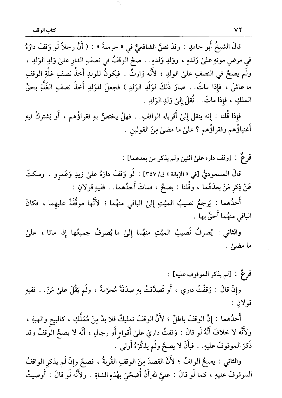 قال الشيخ أبو حامد: وقد نص الشافعي في (حرملة) : (أن رجلا لو وقف داره في مرض موته على ولده، وولد ولده.. صح الوقف في نصف الدار على ولد الولد، ولم يصح في النصف على الولد؛ لأنه وارث. فيكون للولد أخذ نصف غلة الوقف ما عاش، فإذا مات.. صار ذلك لولد الولد) فجعل للولد أخذ نصف الغلة بحق الملك، فإذا مات.. نقل إلى ولد الولد.