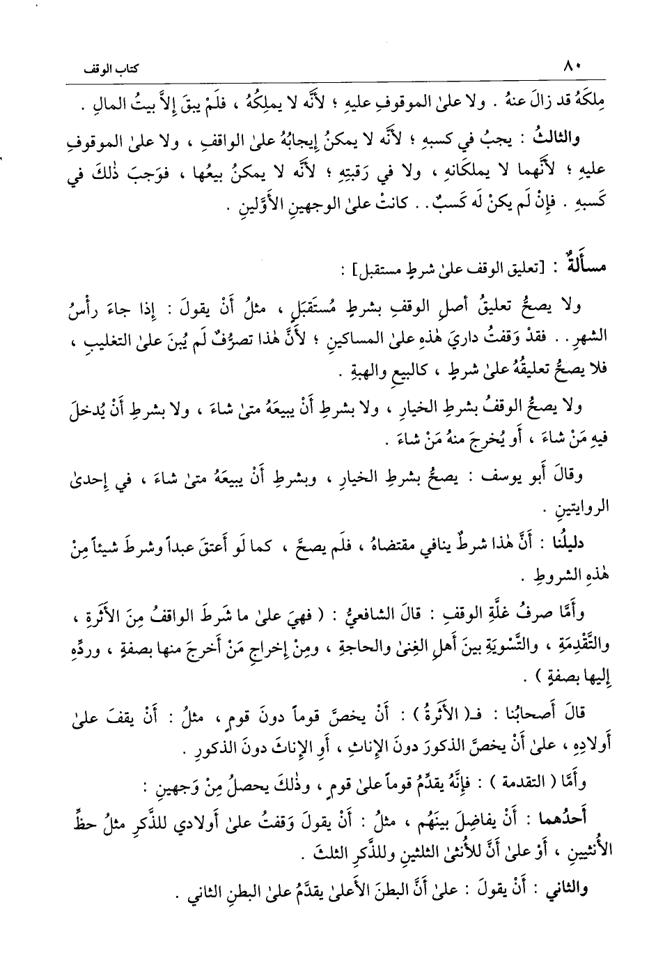 ولا يصح تعليق أصل الوقف بشرط مستقبل، مثل أن يقول: إذا جاء رأس الشهر.. فقد وقفت داري هذه على المساكين؛ لأن هذا تصرف لم يبن على التغليب، فلا يصح تعليقه على شرط، كالبيع والهبة.