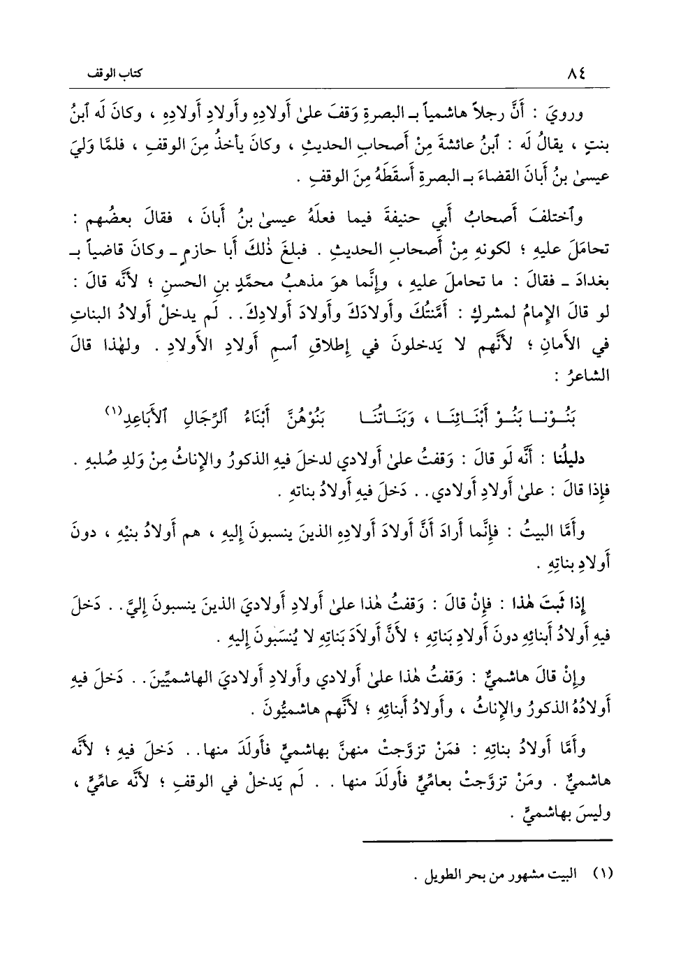 وروي: أن رجلا هاشميا بالبصرة وقف على أولاده وأولاد أولاده، وكان له ابن بنت، يقال له: ابن عائشة من أصحاب الحديث، وكان يأخذ من الوقف، فلما ولي عيسى بن أبان القضاء بالبصرة أسقطه من الوقف.