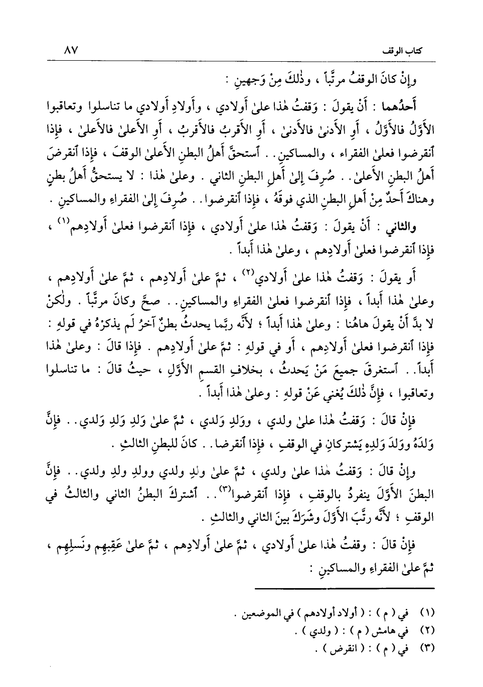 أو يقول: وقفت هذا على أولادي، ثم على أولادهم، ثم على أولادهم، وعلى هذا أبدًا، فإذا انقرضوا فعلى الفقراء والمساكين.. صح وكان مرتبًا. ولكن لا بد أن يقول هاهنا: وعلى هذا أبدًا؛ لأنه ربما يحدث بطن آخر لم يذكره في قوله: فإذا انقرضوا فعلى أولادهم، أو في قوله: ثم على أولادهم. فإذا قال: وعلى هذا أبدًا.. استغرق جميع من يحدث، بخلاف القسم الأول، حيث قال: ما تناسلوا وتعاقبوا، فإن ذلك يغني عن قوله: وعلى هذا أبدًا.