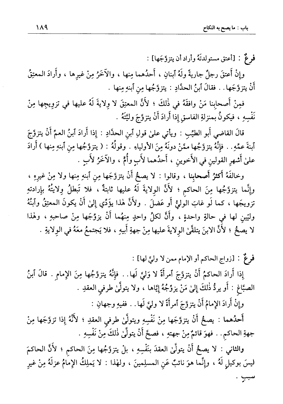 وخالفه أكثر أصحابنا، وقالوا: لا يصح أن يتزوجها من ابنه منها ولا من غيره، وإنما يتزوجها من الحاكم، لأن الولاية له عليها ثابتة، فلا تبطل ولايته بإرادته تزويجها، كما لو غاب الولي أو عضل. ولأن هذا يؤدي إلى أن يكون المعتق وابنه وليين لها في حالة واحدة، وأن لكل واحد منهما أن يزوجها من صاحبه، وهذا لا يصح، لأن الابن يتلقى الولاية عليها من جهة أبيه، فلا يجتمع معه في الولاية.