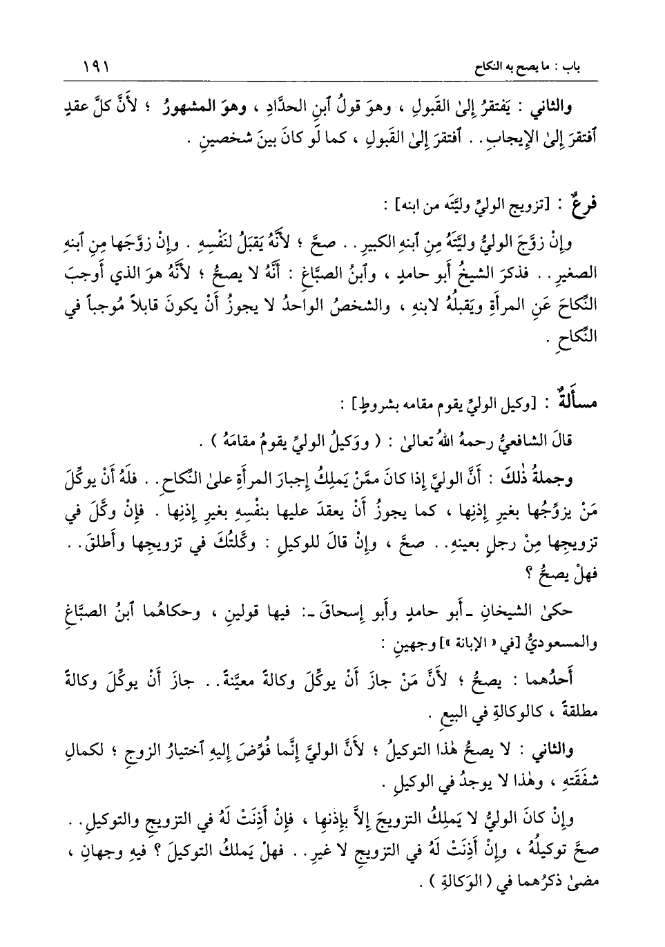 وإن زوج الولي وليته من ابنه الكبير.. صح، لأنه يقبل لنفسه. وإن زوجها من ابنه الصغير.. فذكر الشيخ أبو حامد، وابن الصباغ: أنه لا يصح، لأنه هو الذي أوجب النكاح عن المرأة ويقبله لابنه، والشخص الواحد لا يجوز أن يكون قابلا موجبا في النكاح.