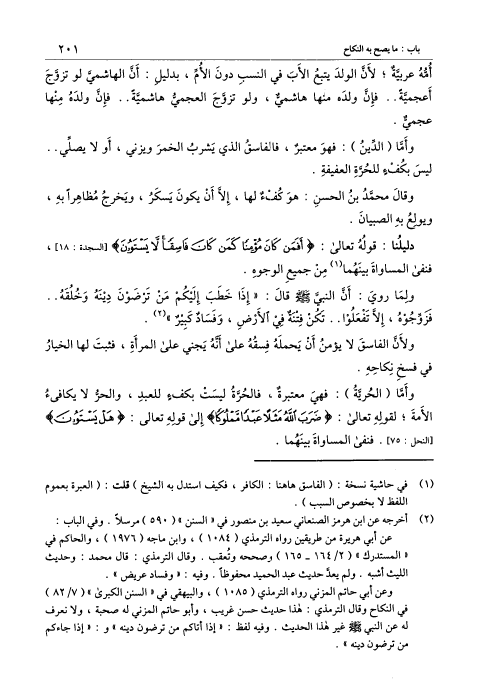 وأما (الدين) : فهو معتبر، فالفاسق الذي يشرب الخمر ويزني، أو لا يصلي.. ليس بكفء للحرة العفيفة.