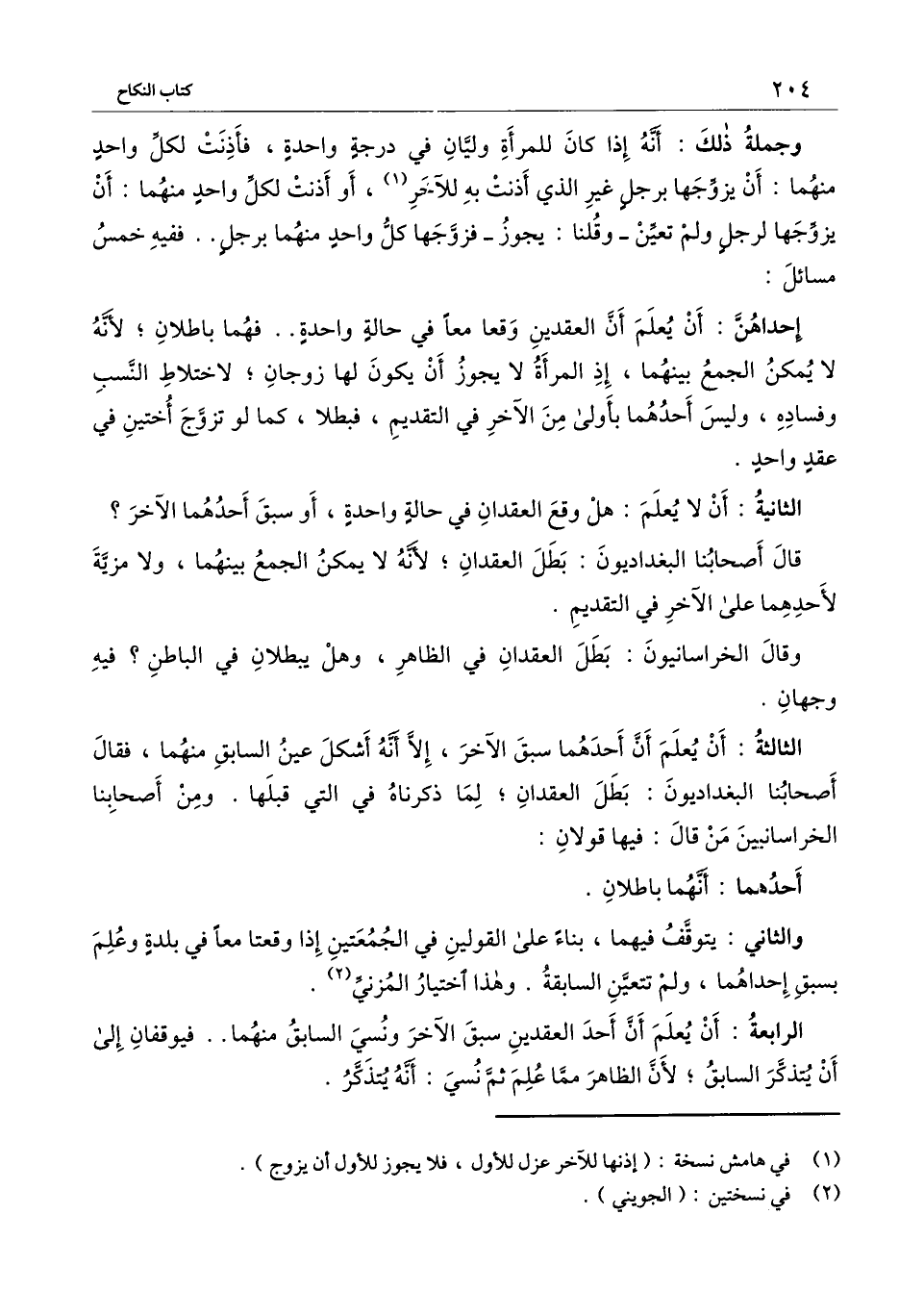 إحداهن: أن يعلم أن العقدين وقعا معا في حالة واحدة.. فهما باطلان، لأنه لا يمكن الجمع بينهما، إذ المرأة لا يجوز أن يكون لها زوجان، لاختلاط النسب وفساده، وليس أحدهما بأولى من الآخر في التقديم، فبطلا، كما لو تزوج أختين في عقد واحد.