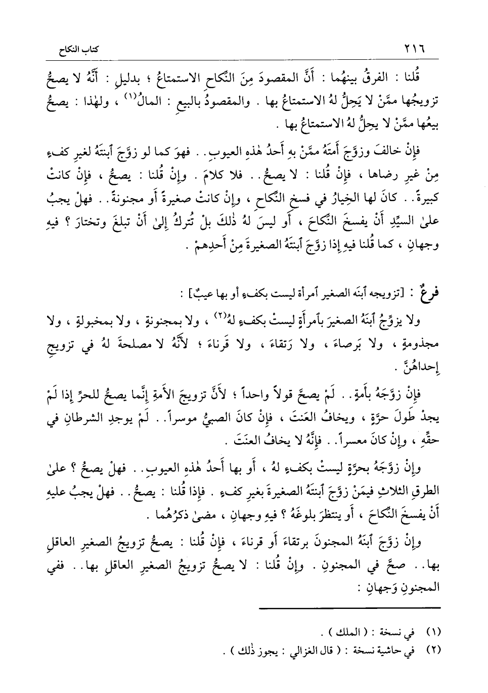 وإن زوجه بحرة ليست بكفء له، أو بها أحد هذه العيوب.. فهل يصح؟ على الطرق الثلاث فيمن زوج ابنته الصغيرة بغير كفء. فإذا قلنا: يصح.. فهل يجب عليه أن يفسخ النكاح، أو ينتظر بلوغه؟ فيه وجهان، مضى ذكرهما.