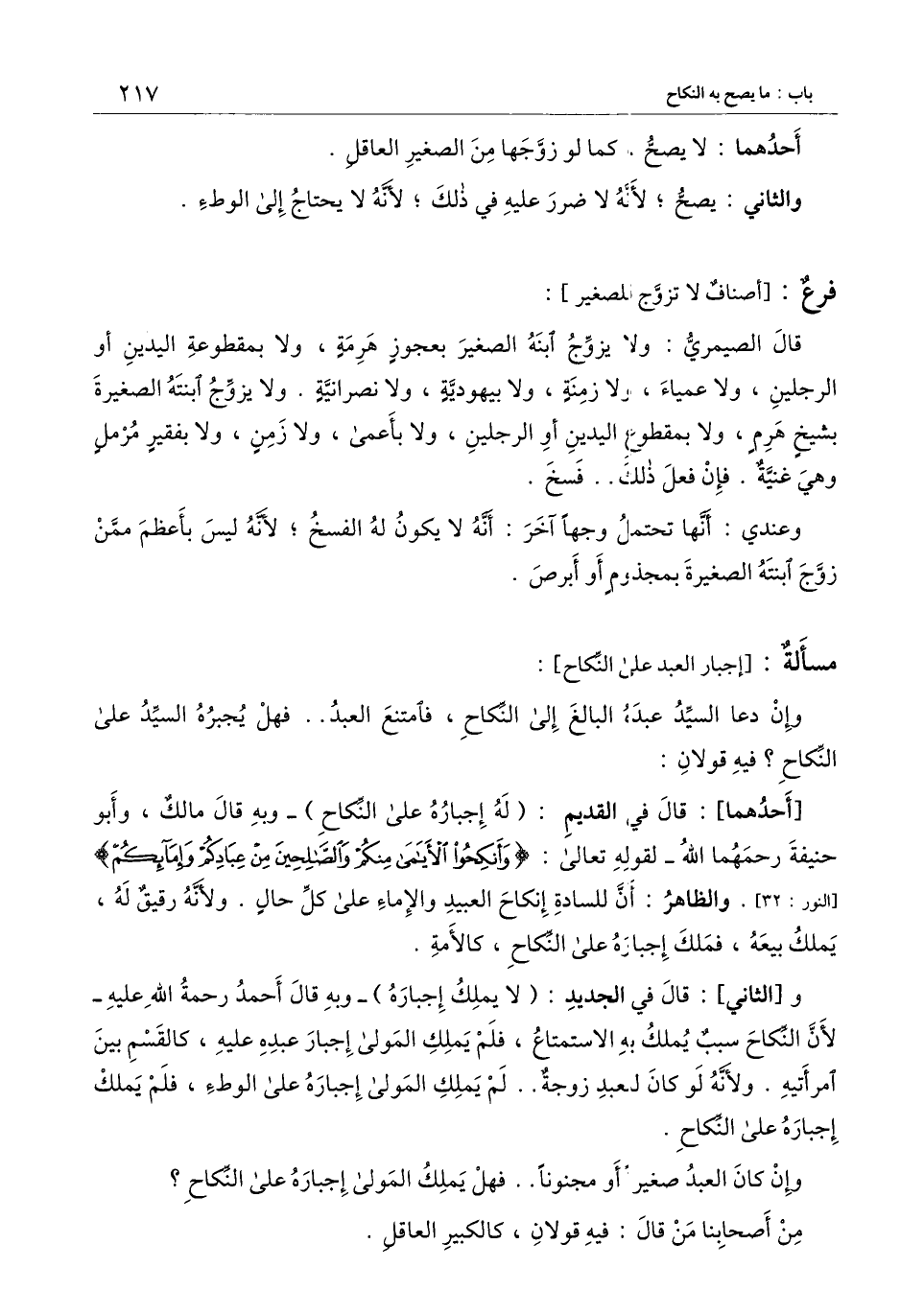 [أحدهما] : قال في القديم: (له إجباره على النكاح) - وبه قال مالك، وأبو حنيفة رحمهما الله - لِقَوْلِهِ تَعَالَى: {وَأَنْكِحُوا الأَيَامَى مِنْكُمْ وَالصَّالِحِينَ مِنْ عِبَادِكُمْ وَإِمَائِكُمْ} [النور: 32] [النور: 32] . والظاهر: أن للسادة إنكاح العبيد والإماء على كل حال. ولأنه رقيق له، يملك بيعه، فملك إجباره على النكاح، كالأمة.