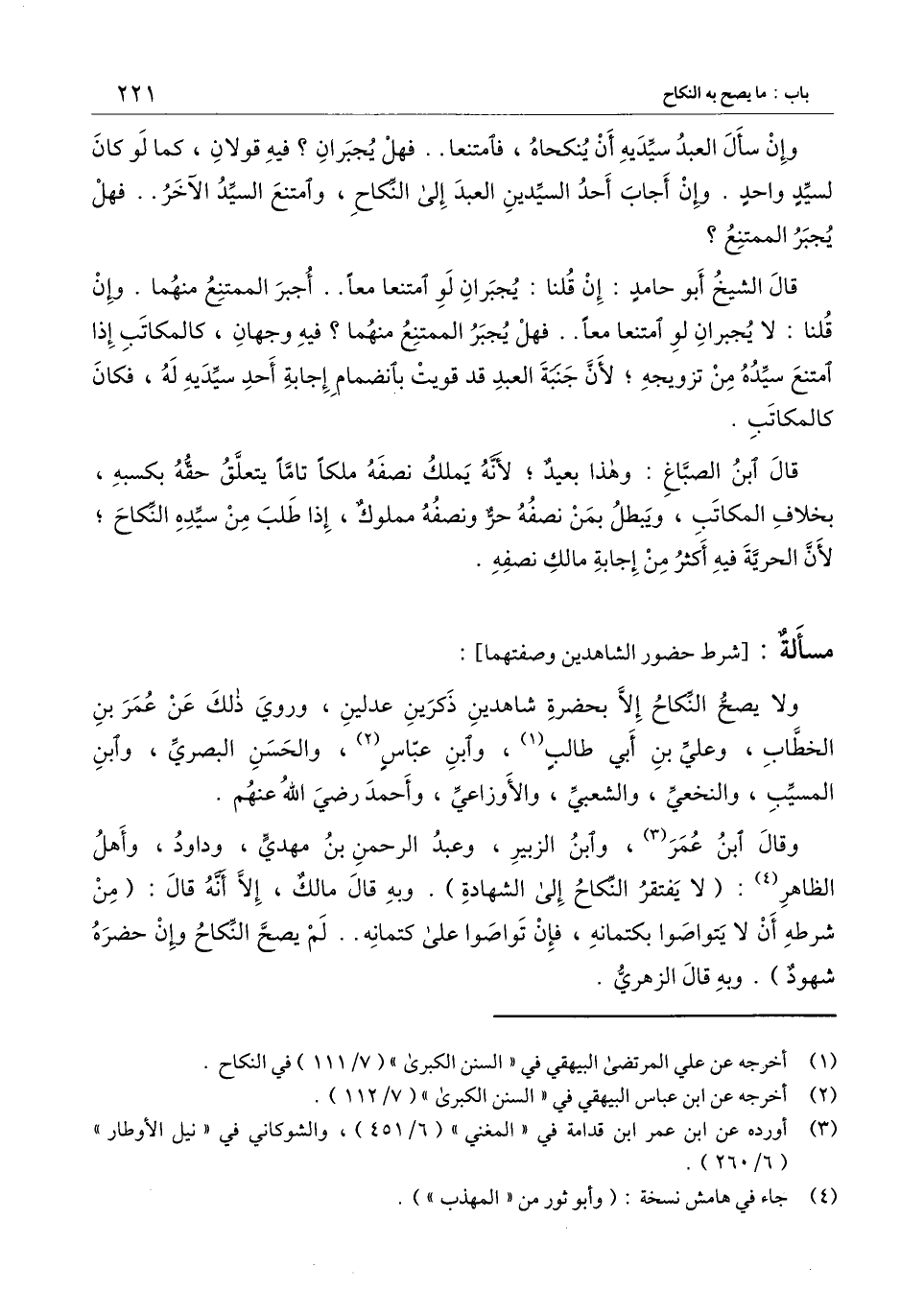 وإن سأل العبد سيديه أن ينكحاه، فامتنعا..فهل يجبران؟ فيه قولان، كما لو كان لسيد واحد. وإن أجاب أحد السيدين العبد إلى النكاح، وامتنع السيد الآخر.. فهل يجبر الممتنع؟