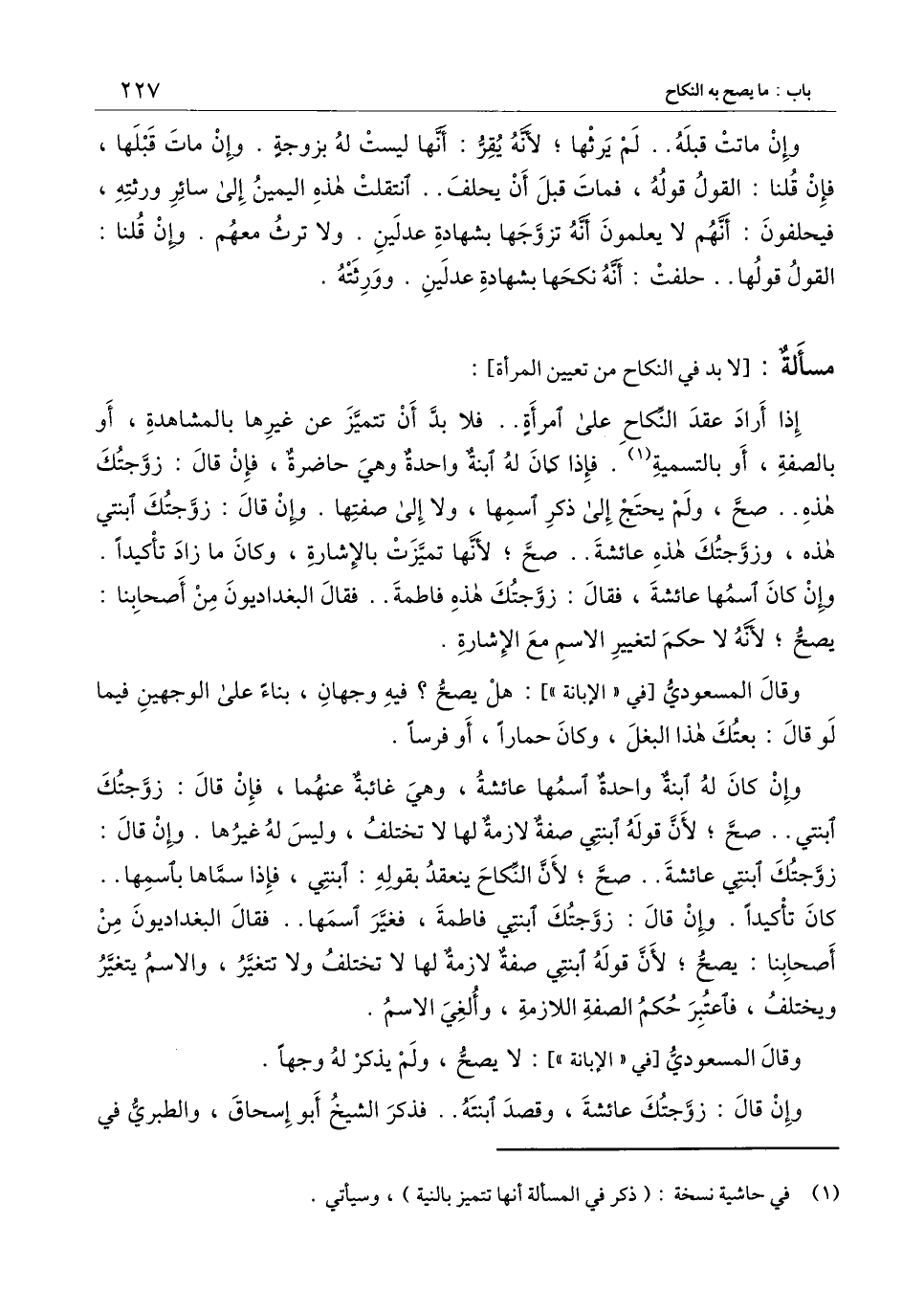 إذا أراد عقد النكاح على امرأة.. فلا بد أن تتميز عن غيرها بالمشاهدة، أو بالصفة، أو بالتسمية. فإذا كان له ابنة واحدة وهي حاضرة، فإن قال: زوجتك هذه.. صح، ولم يحتج إلى ذكر اسمها، ولا إلى صفتها. وإن قال: زوجتك ابنتي هذه، وزوجتك هذه عائشة.. صح، لأنها تميزت بالإشارة، وكان ما زاد تأكيدا. وإن كان اسمها عائشة، فقال: زوجتك هذه فاطمة.. فقال البغداديون من أصحابنا: يصح، لأنه لا حكم لتغيير الاسم مع الإشارة.