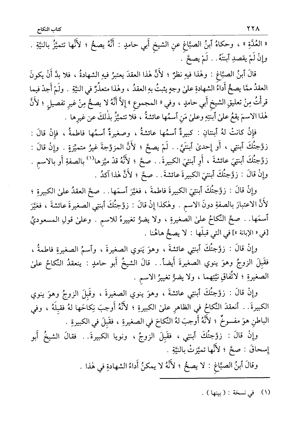 قال ابن الصباغ: وهذا فيه نظر، لأن هذا العقد يعتبر فيه الشهادة، فلا بد أن يكون العقد مما يصح أداء الشهادة على وجه يثبت به العقد، وهذا متعذر في النية. ولم أجد فيما قرأت من تعليق الشيخ أبي حامد، وفي " المجموع " إلا أنه لا يصح من غير تفصيل، لأن هذا الاسم يقع على ابنته وعلى من اسمها عائشة، فلا تتميز بذلك عن غيرها.
