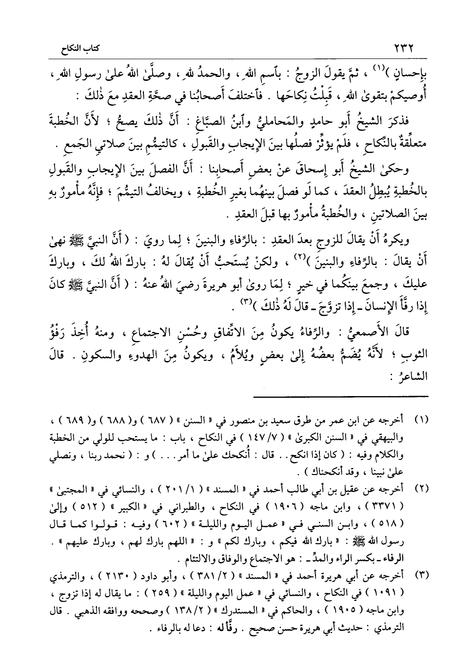 ويكره أن يقال للزوج بعد العقد: بالرفاء والبنين، لما روي: «أن النبي - صَلَّى اللَّهُ عَلَيْهِ وَسَلَّمَ - نهى أن يقال: بالرفاء والبنين» ، ولكن يستحب أن يقال له: بارك الله لك، وبارك عليك، وجمع بينكما في خير، لما روى أبو هريرة - رَضِيَ اللَّهُ عَنْهُ -: «أن النبي - صَلَّى اللَّهُ عَلَيْهِ وَسَلَّمَ - كان إذا رفأ الإنسان - إذا تزوج - قال له ذلك» .