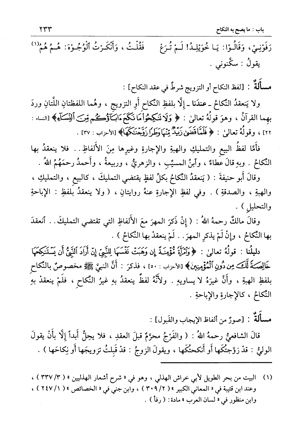 ولا ينعقد النكاح- عندنا- إلا بلفظ النكاح أو التزويج، وهما اللفظتان اللتان ورد بهما القرآن، وهو قَوْله تَعَالَى: {وَلا تَنْكِحُوا مَا نَكَحَ آبَاؤُكُمْ مِنَ النِّسَاءِ} [النساء: 22] [النساء:22] ، وقَوْله تَعَالَى: {فَلَمَّا قَضَى زَيْدٌ مِنْهَا وَطَرًا زَوَّجْنَاكَهَا} [الأحزاب: 37] [الأحزاب:37] .