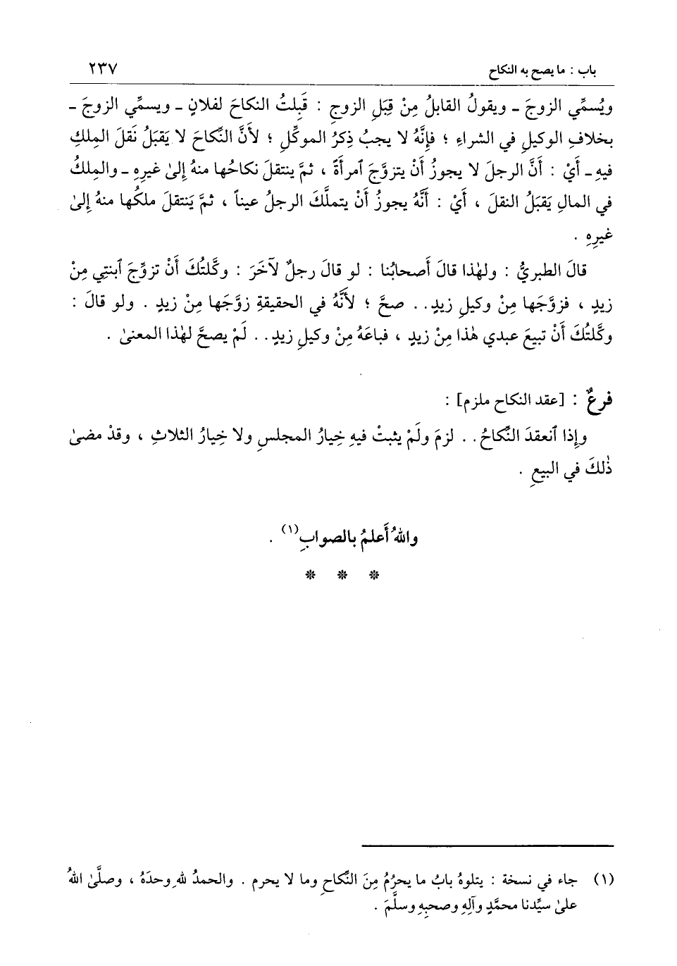 ويسمي الزوج- ويقول القابل من قبل الزوج: قبلت النكاح لفلان- ويسمي الزوج- بخلاف الوكيل في الشراء، فإنه لا يجب ذكر الموكل، لأن النكاح لا يقبل نقل الملك فيه- أي: أن الرجل لا يجوز أن يتزوج امرأة، ثم ينتقل نكاحها منه إلى غيره- والملك في المال يقبل النقل، أي: أنه يجوز أن يتملك الرجل عيناً، ثم ينتقل ملكها منه إلى غيره.