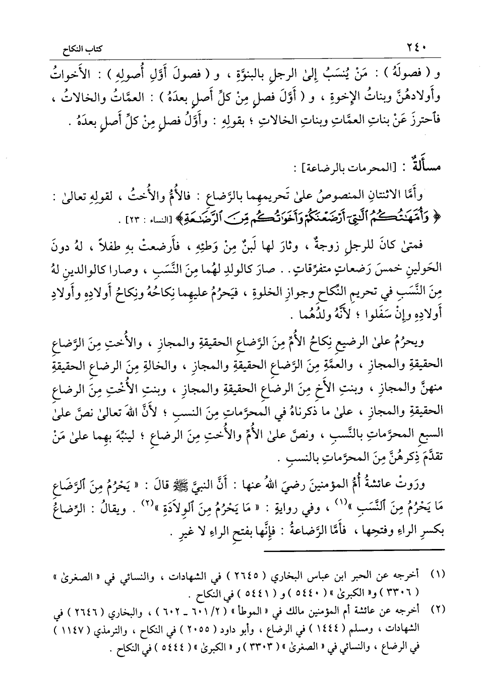 وروت عائشة أم المؤمنين - رَضِيَ اللَّهُ عَنْهَا -: أن النبي - صَلَّى اللَّهُ عَلَيْهِ وَسَلَّمَ - قال: «يحرم من الرضاع ما يحرم من النسب» ، وفي رواية: «ما يحرم من الولادة» . ويقال: الرضاع بكسر الراء وفتحها، فإما الرضاعة: فإنها بفتح الراء لا غير.