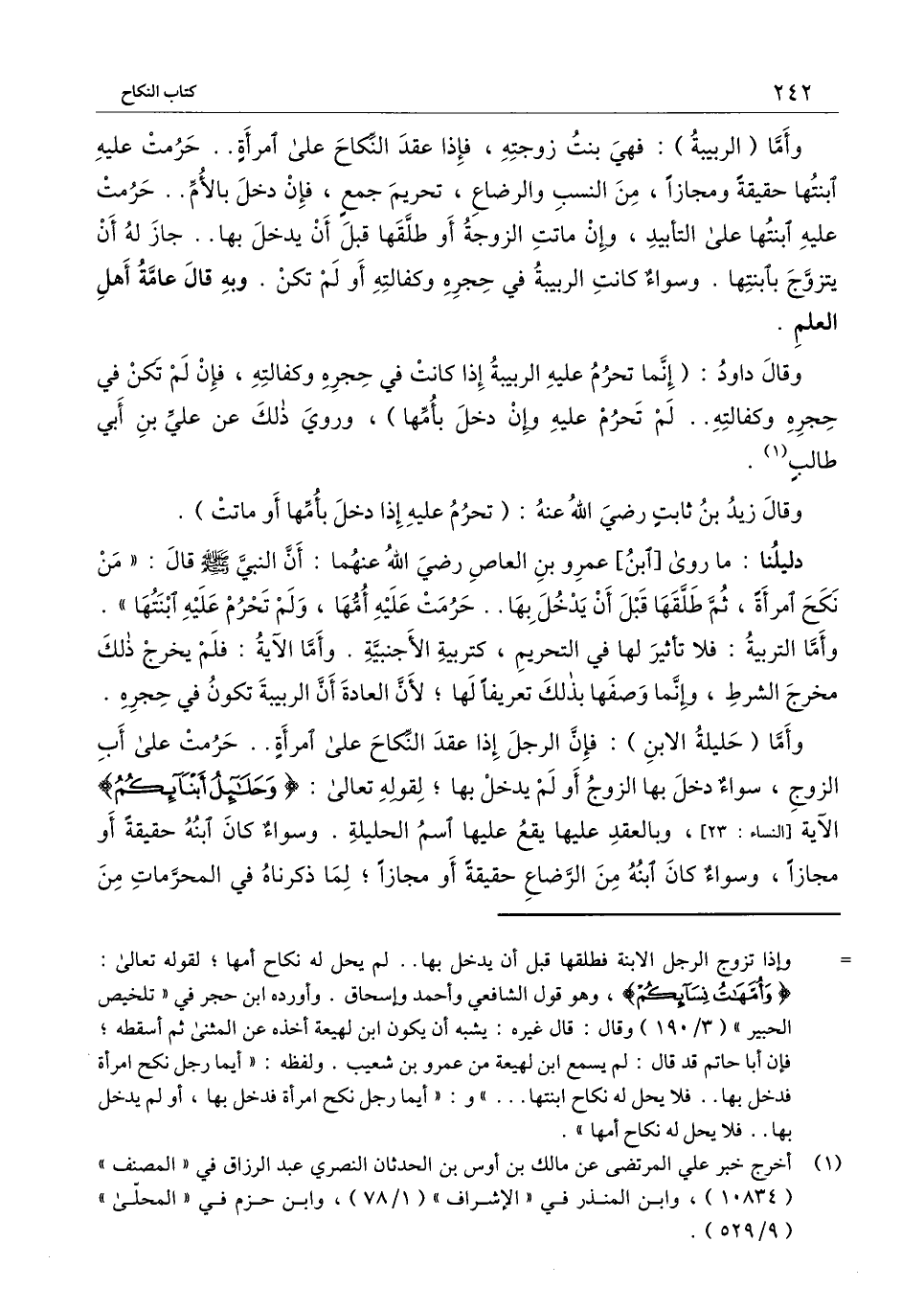 وأما (الربيبة) : فهي بنت زوجته، فإذا عقد النكاح على امرأة.. حرمت عليه ابنتها حقيقة ومجازاً، من النسب والرضاع، تحريم جمع، فإن دخل بالأم.. حرمت عليه ابنتها على التأبيد، وإن ماتت الزوجة أو طلقها قبل أن يدخل بها.. جاز له أن يتزوج بابنتها. وسواء كانت الربيبة في حجره وكفالته أو لم تكن.. وبه قال عامة أهل العلم.