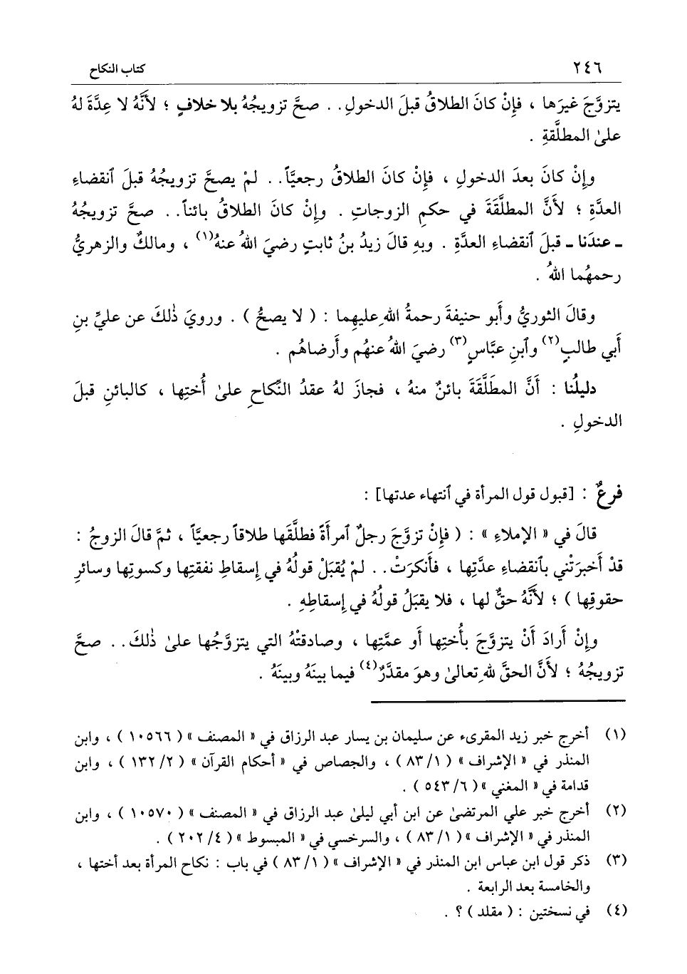 وإن كان بعد الدخول، فإن كان الطلاق رجعياً.. لم يصح تزويجه قبل انقضاء العدة، لأن المطلقة في حكم الزوجات. وإن كان الطلاق بائناً.. صح تزويجه- عندنا- قبل انقضاء العدة. وبه قال زيد بن ثابت - رَضِيَ اللَّهُ عَنْهُ -، ومالك والزهري رحمهما الله.