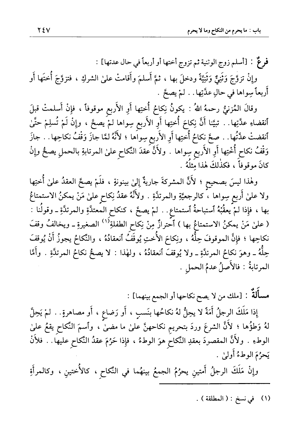 وهذا ليس بصحيح، لأن المشركة جارية إلى بينونة، فلم يصح العقد على أختها ولا على أربع سواها، كالرجعية والمرتدة. ولأنه عقد نكاح على من يمكن الاستمتاع بها، فإذا لم يعقبه استباحة استمتاع.. لم يصح، كنكاح المعتدة والمرتدة- وقولنا: (على من يمكن الاستمتاع بها) احتراز من نكاح الطفلة الصغيرة- ويخالف وقف نكاحها، فإن الموقوف حله، ونكاح الأخت يوقف انعقاده، والنكاح يجوز أن يوقف حله- وهو نكاح المرتدة- ولا يوقف انعقاده، ولهذا: لا يصح نكاح المرتدة. وأما المرتابة: فالأصل عدم الحمل.