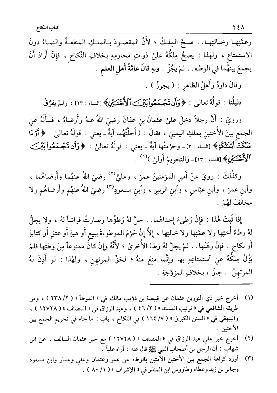 وروي: أن رجلاً دخل على عثمان بن عفان - رَضِيَ اللَّهُ عَنْهُ - وأرضاه، فسأله عن الجمع بين الأختين بملك اليمين، فقال: (أحلتهما آية- يعني: قَوْله تَعَالَى: {أَوْ مَا مَلَكَتْ أَيْمَانُكُمْ} [النساء: 3] [النساء:3]- وحرمتها آية- يعني: قَوْله تَعَالَى: {وَأَنْ تَجْمَعُوا بَيْنَ الأُخْتَيْنِ} [النساء: 23] [النساء:23]- والتحريم أولى) .