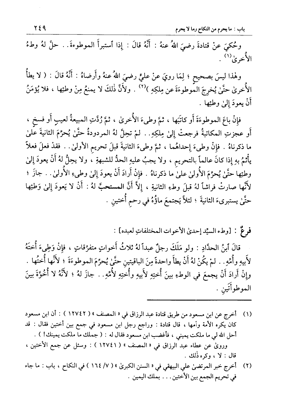 فإن باع الموطوءة أو كاتبها، ثم وطئ الأخرى، ثم ردت المبيعة لعيب أو فسخ، أو عجزت المكاتبة فرجعت إلى ملكه.. لم تحل له المردودة حتى يحرم الثانية على ما ذكرناه. فإن وطئ إحداهما، ثم وطئ الثانية قبل تحريم الأولى.. فقد فعل فعلاً يأثم به إذا كان عالماً بالتحريم، ولا يجب عليه الحد للشبهة، ولا يحل له أن يعود إلى وطئها حتى يحرم الأولى على ما ذكرناه. فإن أراد أن يعود إلى وطء الأولى.. جاز؛ لأنها صارت فراشاً له قبل وطء الثانية، إلا أن المستحب له: أن لا يعود إلى وطئها حتى يستبرئ الثانية، لئلا يجتمع ماؤه في رحم أختين.