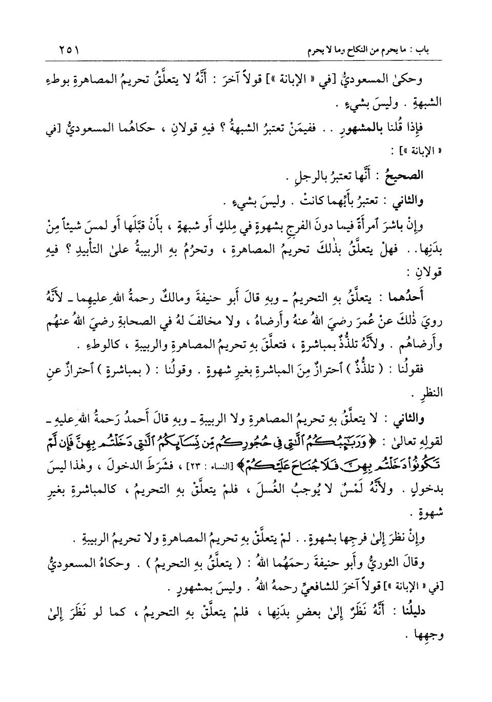 والثاني: لا يتعلق به تحريم المصاهرة ولا الربيبة-وبه قال أحمد رحمة الله عليه- لِقَوْلِهِ تَعَالَى: {وَرَبَائِبُكُمُ اللاتِي فِي حُجُورِكُمْ مِنْ نِسَائِكُمُ اللاتِي دَخَلْتُمْ بِهِنَّ فَإِنْ لَمْ تَكُونُوا دَخَلْتُمْ بِهِنَّ فَلا جُنَاحَ عَلَيْكُمْ} [النساء: 23] [النساء:23] ، فشرط الدخول، وهذا ليس بدخول، ولأنه لمس لا يوجب الغسل، فلم يتعلق به التحريم، كالمباشرة بغير شهوة.