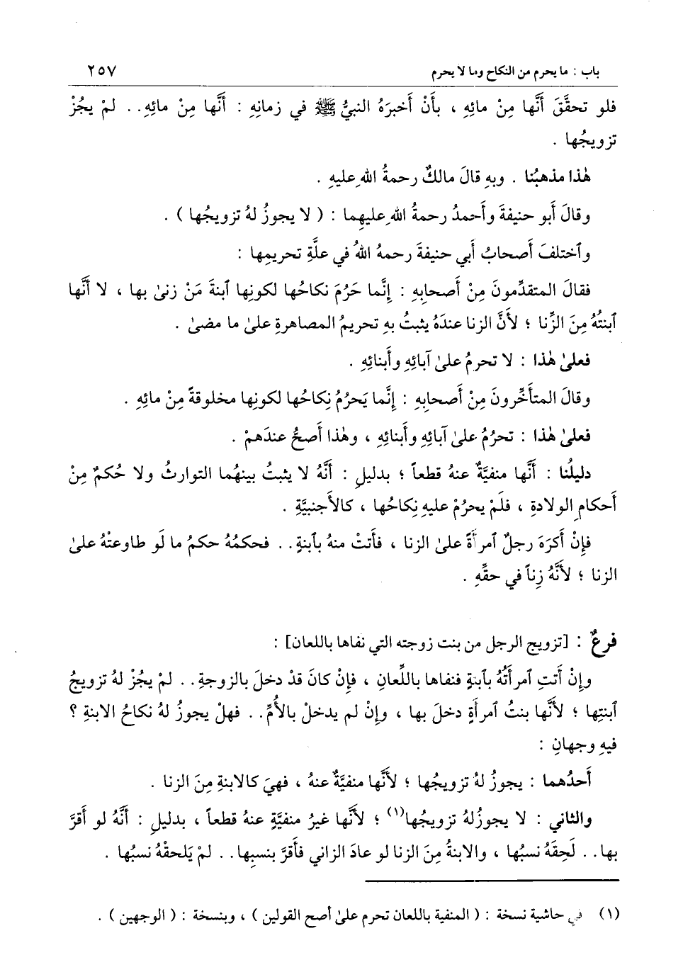 والثاني: لا يجوز له تزويجها؛ لأنها غير منفية عنه قطعا، بدليل: أنه لو أقر بها.. لحقه نسبها، والابنة من الزنا لو عاد الزاني فأقر بنسبها.. لم يلحقه نسبها.