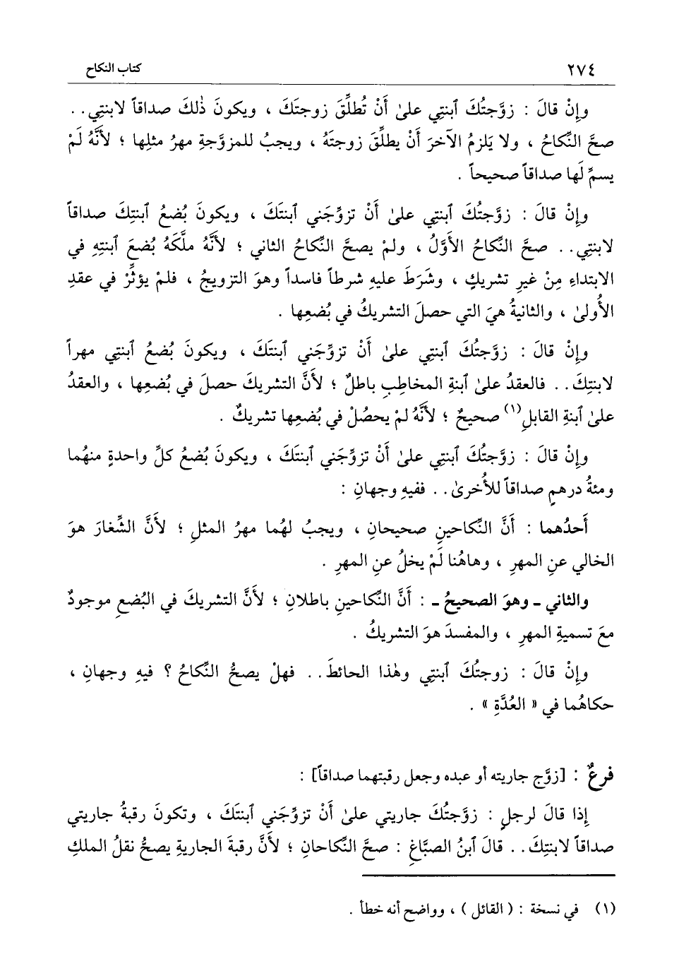 إذا قال لرجل: زوجتك جاريتي على أن تزوجني ابنتك، وتكون رقبة جاريتي صداقا لابنتك.. قال ابن الصباغ: صح النكاحان؛ لأن رقبة الجارية يصح نقل الملك