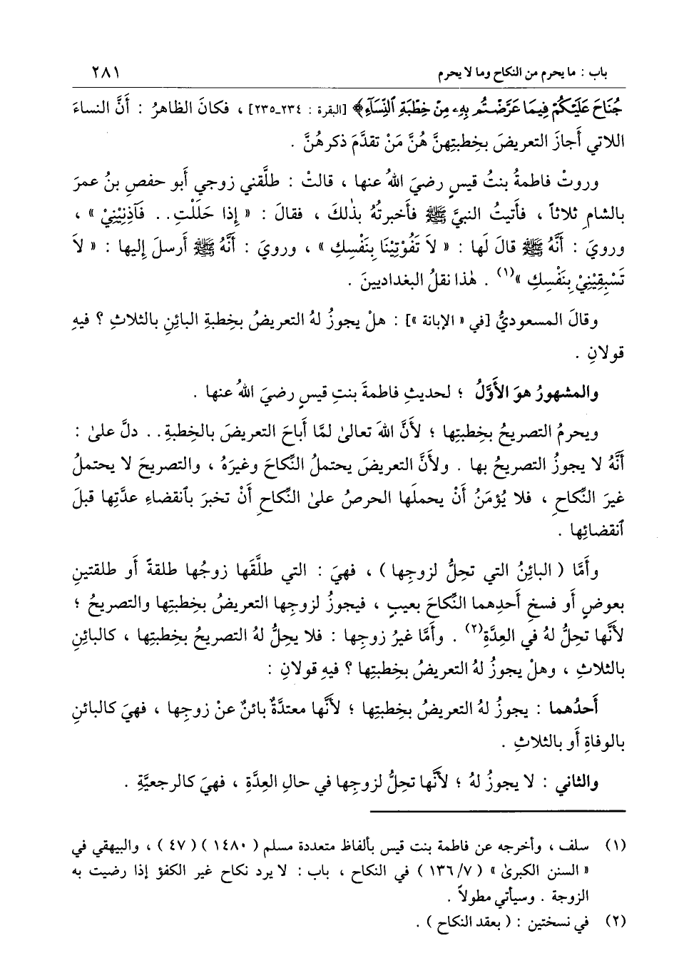 «وروت فاطمة بنت قيس - رَضِيَ اللَّهُ عَنْهَا -، قالت، طلقني زوجي أبو حفص بن عمرو بالشام ثلاثا، فأتيت النبي - صَلَّى اللَّهُ عَلَيْهِ وَسَلَّمَ - فأخبرته بذلك، فقال: " إذا حللت.. فآذنيني» ، وروي: أنه - صَلَّى اللَّهُ عَلَيْهِ وَسَلَّمَ - قال لها: " لا تفوتينا بنفسك "، وروي: أنه - صَلَّى اللَّهُ عَلَيْهِ وَسَلَّمَ - أرسل إليها: " لا تسبقيني بنفسك ". هذا نقل البغداديين.
