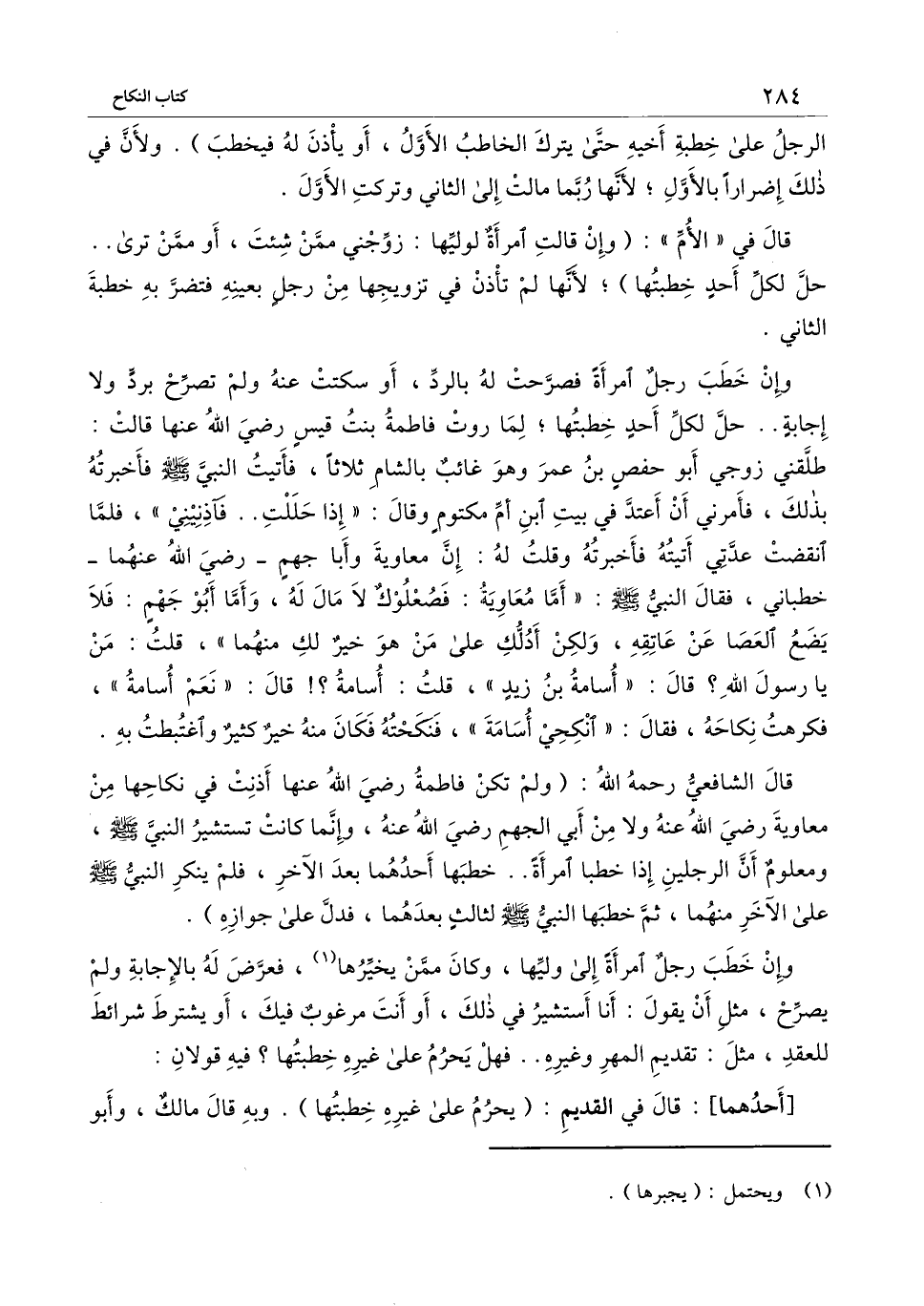 قال الشافعي - رَحِمَهُ اللَّهُ -: (ولم تكن فاطمة - رَضِيَ اللَّهُ عَنْهَا - أذنت في نكاحها من معاوية - رَضِيَ اللَّهُ عَنْهُ - ولا من أبي الجهم - رَضِيَ اللَّهُ عَنْهُ -، وإنما كانت تستشير النبي - صَلَّى اللَّهُ عَلَيْهِ وَسَلَّمَ -، ومعلوم أن الرجلين إذا خطبا امرأة.. خطبها أحدهما بعد الآخر، فلم ينكر النبي - صَلَّى اللَّهُ عَلَيْهِ وَسَلَّمَ - على الآخر منهما، ثم خطبها النبي - صَلَّى اللَّهُ عَلَيْهِ وَسَلَّمَ - لثالث بعدهما، فدل على جوازه) .