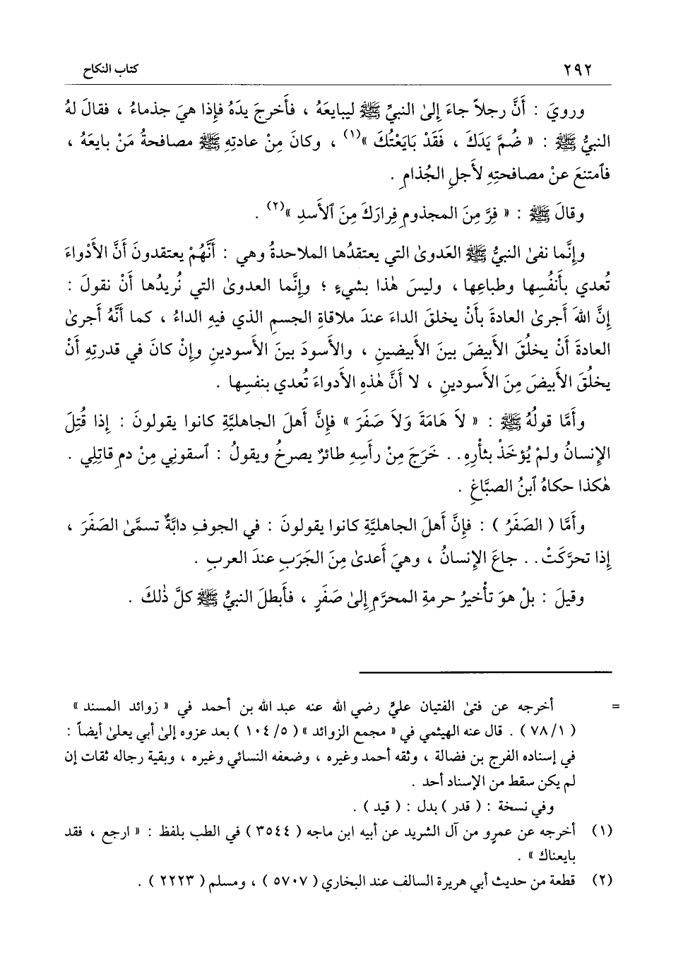 وإنما نفى النبي - صَلَّى اللَّهُ عَلَيْهِ وَسَلَّمَ - العدوى التي يعتقدها الملاحدة وهي: أنهم يعتقدون أن الأدواء تعدي بأنفسها وطباعها، وليس هذا بشيء؛ وإنما العدوى التي نريدها أن نقول: إن الله أجرى العادة بأن يخلق الداء عند ملاقاة الجسم الذي فيه الداء، كما أنه أجرى العادة أن يخلق الأبيض بين الأبيضين، والأسود بين الأسودين وإن كان في قدرته أن يخلق الأبيض من الأسودين، لا أن هذه الأدواء تعدي بنفسها.
