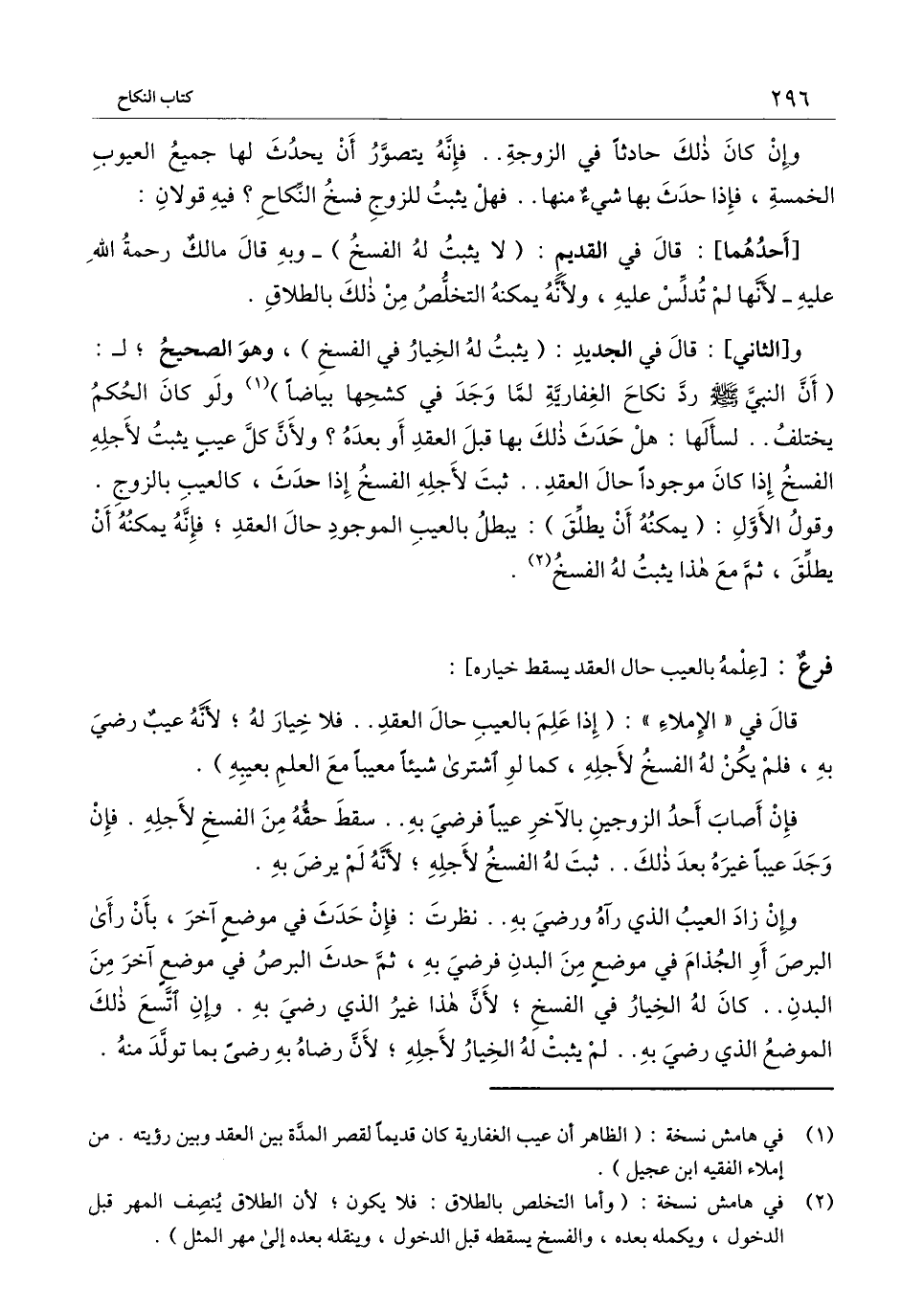 و [الثاني] : قال في الجديد: (يثبت له الخيار في الفسخ) ، وهو الصحيح؛ لـ: (أن النبي - صَلَّى اللَّهُ عَلَيْهِ وَسَلَّمَ - رد نكاح الغفارية لما وجد في كشحها بياضا) ولو كان الحكم يختلف.. لسألها: هل حدث ذلك بها قبل العقد أو بعده؟ ولأن كل عيب يثبت لأجله الفسخ إذا كان موجودا حال العقد.. ثبت لأجله الفسخ إذا حدث، كالعيب بالزوج. وقول الأول: (يمكنه أن يطلق) : يبطل بالعيب الموجود حال العقد، فإنه يمكنه أن يطلق، ثم مع هذا يثبت له الفسخ.