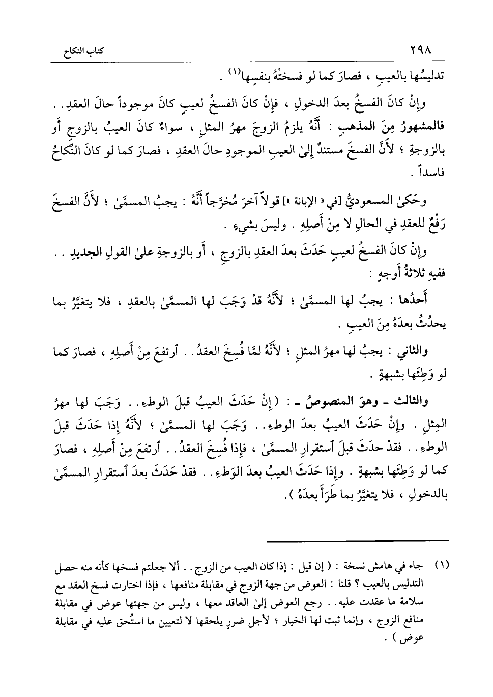 والثالث - وهو المنصوص -: (إن حدث العيب قبل الوطء.. وجب لها مهر المثل. وإن حدث العيب بعد الوطء.. وجب لها المسمى؛ لأنه إذا حدث قبل الوطء.. فقد حدث قبل استقرار المسمى، فإذا فسخ العقد.. ارتفع من أصله، فصار كما لو وطئها بشبهة. وإذا حدث العيب بعد الوطء.. فقد حدث بعد استقرار المسمى بالدخول، فلا يتغير بما طرأ بعده) .