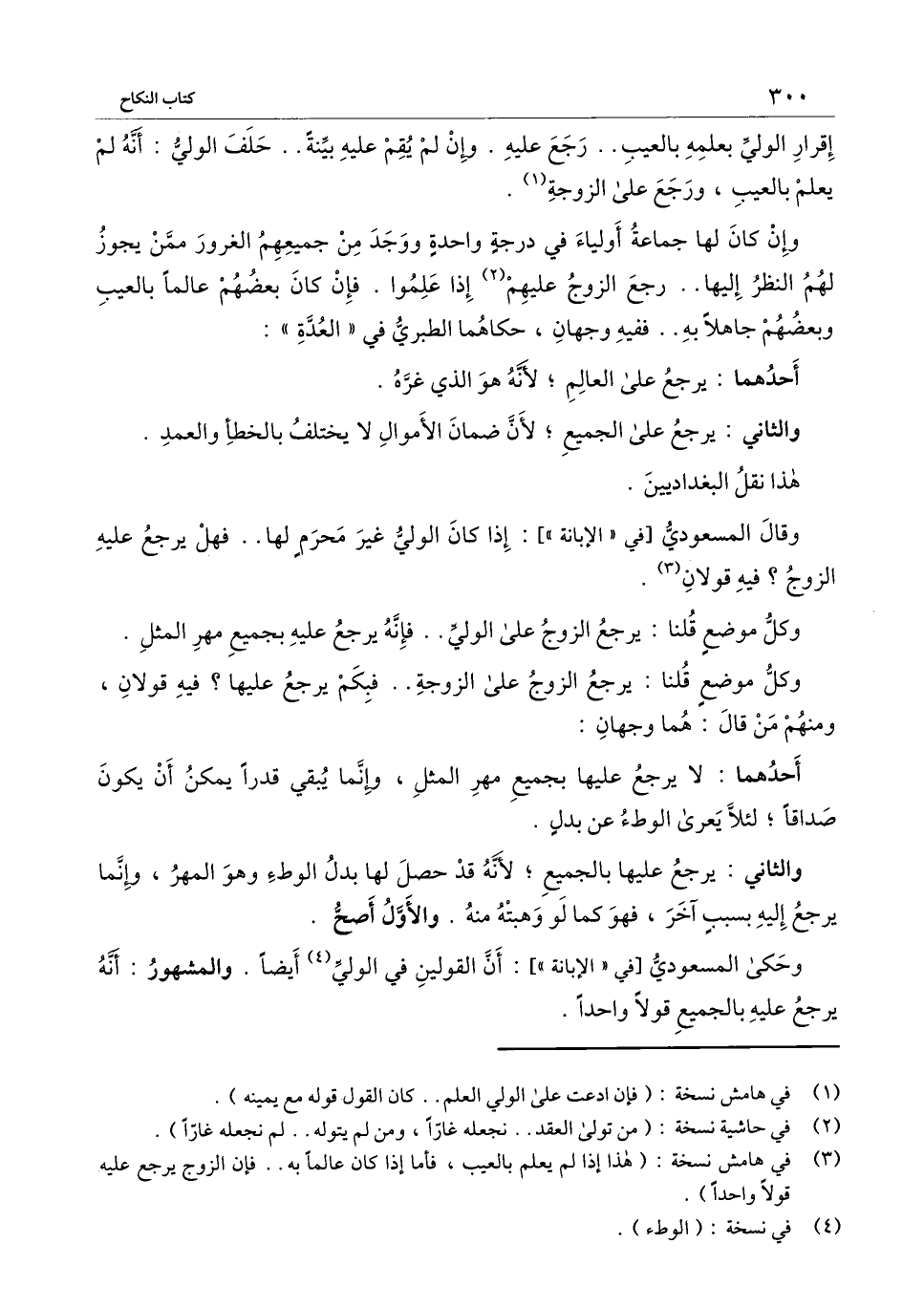وحكي المسعودي [في " الإبانة "] : أن القولين في الولي أيضا. والمشهور: أنه يرجع عليه بالجميع قولا واحدا.