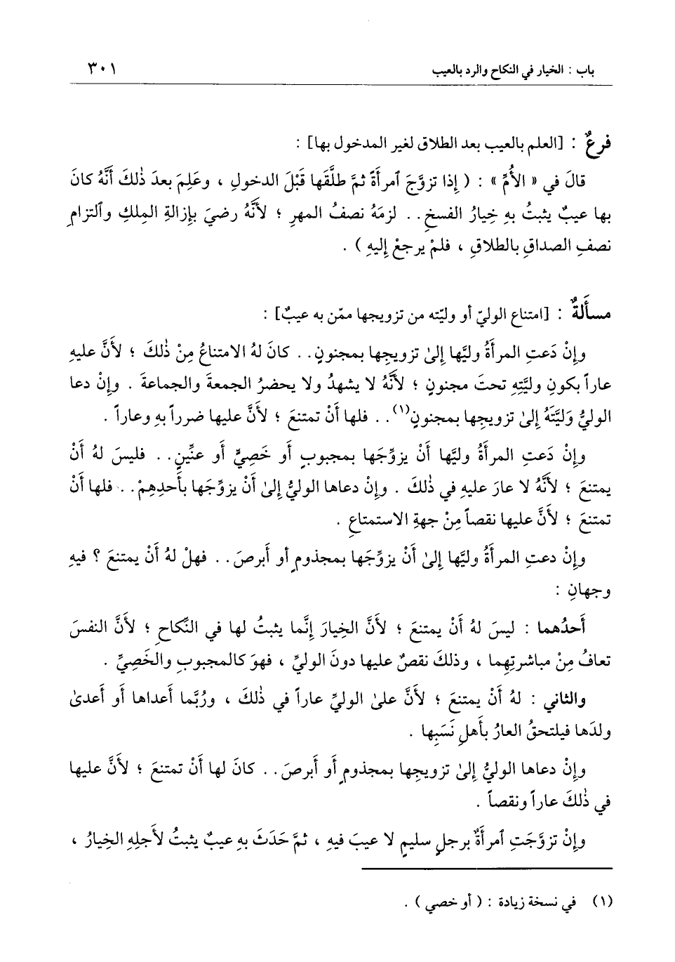 وإن دعت المرأة وليها أن يزوجها بمجبوب أو خصي أو عنين.. فليس له أن يمتنع؛ لأنه لا عار عليه في ذلك. وإن دعاها الولي إلى أن يزوجها بأحدهم.. فلها أن تمتنع؛ لأن عليها نقصا من جهة الاستمتاع.